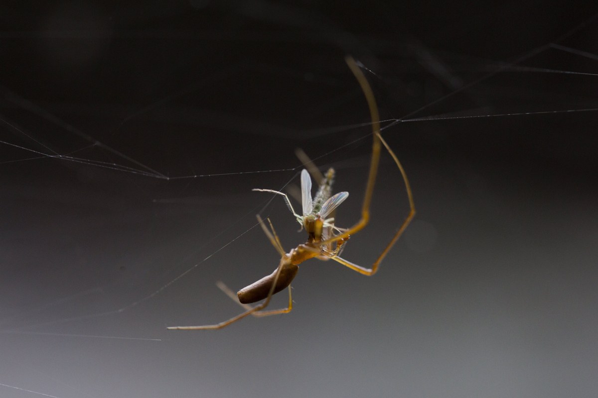 epa06317362 A long jawed spider (Tetragnathidae) eats a Chironomus mosquito sitting in a cobweb that covers the vegetation along the Sorek River (Nahal Sorek) drainage basins in the Jerusalem's Hills, near Jerusalem, Israel, 09 November 2017. The cobwebs are made by millions of long jawed spiders (Tetragnathidae) which settled on the vegetation of the Nahal Sorek following the Chironomus mosquito breeding. EPA/ABIR SULTAN