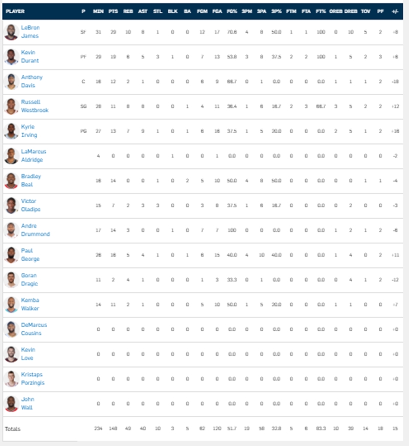 Πρώτος σκόρερ των νικητών αλλά και του αγώνα ο Τζέιμς με 29 πόντους, ενώ στην αντίπερα όχθη οι ΝτεΡοζάν και Λίλαρντ είχαν από 21 πόντους. Στον τομέα των ριμπάουντ οι Τζέιμς και Ουέστμπρουκ είχαν από εννέα, ενώ για την ομάδα του Κάρι, ο Τάουνς μάζεψε 10. Διψήφιο αριθμό ασίστ (10) είχε ο Λόρι για τους ηττημένους, ενώ για την Team LeBron ο Ίρβινγκ είχε εννέα.