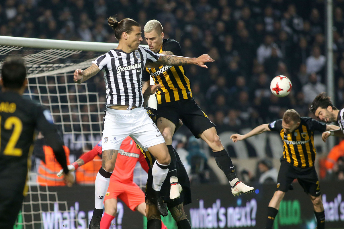 Ο παίκτης του ΠΑΟΚ, Αλεξάνταρ Πρίγιοβιτς (2Α), διεκδικεί την κατοχή της μπάλας από τον παίκτη της ΑΕΚ, Όγκνιεν Βράνιες (Κ), κατά τη διάρκεια του αγώνα ποδοσφαίρου ΠΑΟΚ - ΑΕΚ, για την 25η αγωνιστική του πρωταθλήματος Super League, που διεξήχθη στο γήπεδο Τούμπας, Θεσσαλονίκη, Κυριακή 11 Μαρτίου 2018. ΑΠΕ-ΜΠΕ/ PIXEL/ STR