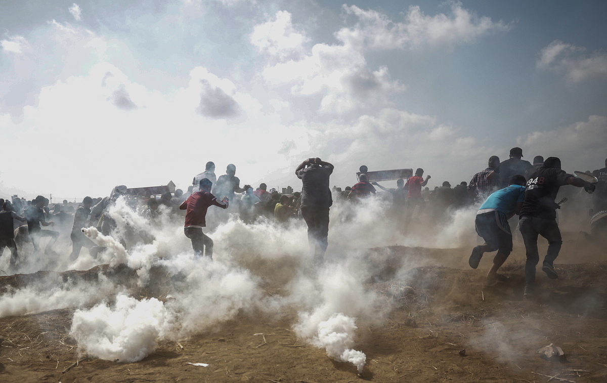 Palestinians protesters run for cover from Israeli tear-gas during clashes near the border with Israel in the east of Gaza City, 11 May 2018. Reports state that one protester was killed and more than 200 others were injured during the clashes along the border between Israel and Gaza Strip,Protesters plan to call for the right of Palestinian refugees across the Middle East to return to homes they fled in the war surrounding the 1948 creation of Israel. EPA/MOHAMMED SABER