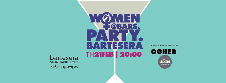Ένα πάρτι πολύ διαφορετικό από τα συνηθισμένα γίνεται την Πέμπτη 21 Φεβρουαρίου μετά τις 20.00 στο Bartesera (Κολοκοτρώνη 25, Στοά Πραξιτέλους). Προσπαθώντας να απαντήσουν στο ερώτημα γιατί είναι τόσο λίγες οι γυναίκες bartender σε μια στιγμή που το bartending αποκτάει ολοένα και μεγαλύτερο κύρος, γυναίκες επαγγελματίες στον χώρο των bar διοργανώνουν το Women@bars.party.bartesera