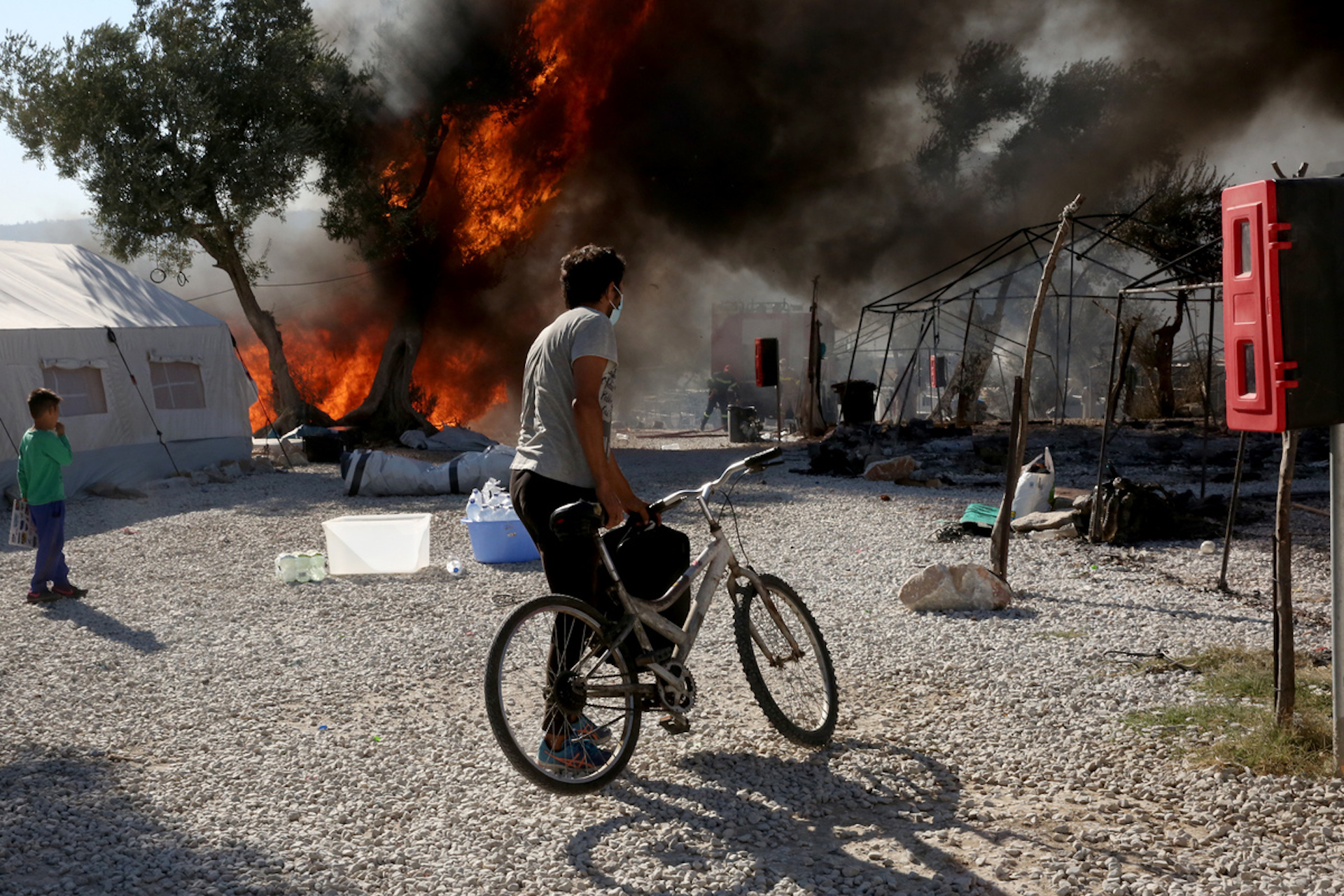 Πρόσφυγες και μετανάστες περπατούν ανάμεσα στα καμένα που άφησε πίσω της η φωτιά στο ΚΥΤ της Μόριας, Πέμπτη 10 Σεπτεμβρίου 2020. Χίλιοι ευάλωτοι αιτούντες άσυλο που διέμεναν στο ΚΥΤ της Μόριας θα φιλοξενηθούν σε πλοίο της Blue Star Ferries που αναμένεται να καταπλεύσει σήμερα στο λιμάνι της Μυτιλήνης και σε δύο αρματαγωγά του πολεμικού ναυτικού που θα μεταβούν αύριο στο νησί, όπως ανακοινώθηκε στη συνέντευξη Τύπου των υπουργών Μετανάστευσης και Εσωτερικών και του προέδρου του ΕΟΔΥ πριν από λίγο στη Λέσβο. Σε κατάσταση έκτακτης ανάγκης για τέσσερις μήνες κηρύχθηκε η Λέσβος με εντολή του υφυπουργού Πολιτικής Προστασίας και Διαχείρισης Κρίσεων Νίκου Χαρδαλιά και απόφαση του Γενικού Γραμματέα Πολιτικής Προστασίας Βασίλη Παπαγεωργίου. Η κατάσταση έκτακτης ανάγκης όπως ανακοινώθηκε από τη ΓΓΠΠ, κηρύχθηκε για λόγους δημόσιας υγείας και αρχίζει από σήμερα. ΑΠΕ-ΜΠΕ/ΑΠΕ-ΜΠΕ/ ΟΡΕΣΤΗΣ ΠΑΝΑΓΙΩΤΟΥ