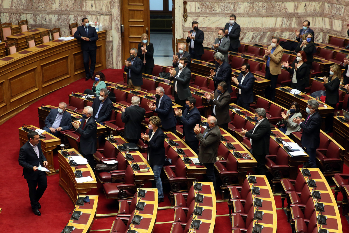 Ο πρόεδρος του ΣΥΡΙΖΑ ΠΣ Αλέξης Τσίπρας (Α) χειροκροτείται από τους όρθιους βουλευτές του μετά το πέρας της ομιλίας του στην ολομέλεια της Βουλής, Τρίτη 30 Μαρτίου 2021. Ξεκίνησε στην Ολομέλεια της Βουλής η συζήτηση για έγκριση της πρότασης που κατέθεσε η ΝΔ για συγκρότηση προανακριτικής επιτροπής που θα εξετάσει τους χειρισμούς του πρώην υπουργού Νίκου Παππά στον διαγωνισμό τηλεοπτικών αδειών και πιο συγκεκριμένα τις σχέσεις του με τον επιχειρηματία Χρήστο Καλογρίτσα. ΑΠΕ-ΜΠΕ/ΑΠΕ-ΜΠΕ/Αλέξανδρος Μπελτές