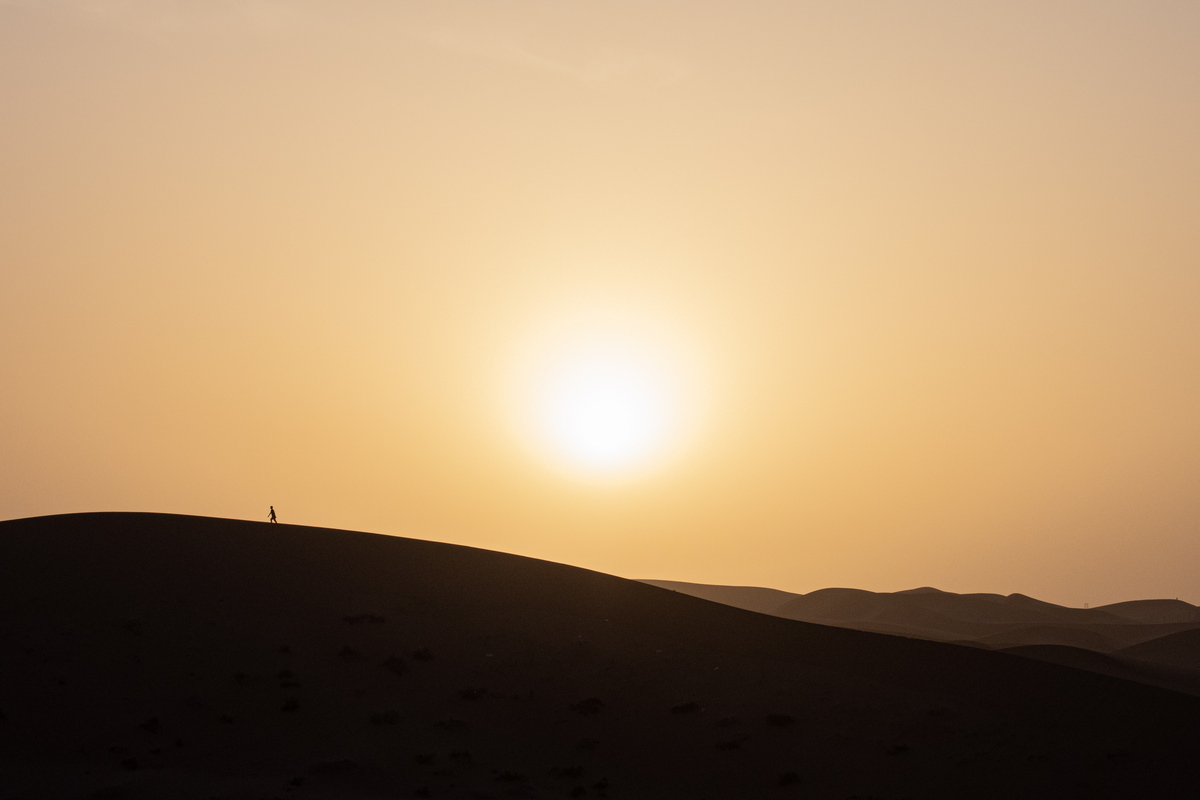 epa09188748 A tourist climbs a dune during a sunset in the Tengger Desert, near Zhongwei city, at the borders of Inner Mongolia and Ningxia autonomous regions, 30 April 2021 (issued 10 May 2021). Tengger Desert is an arid natural region that lies on the southern edge of the massive Gobi Desert and covers about 36,700 square kilometers. It is the fourth largest desert in China. EPA/ROMAN PILIPEY ATTENTION: This Image is part of a PHOTO SET