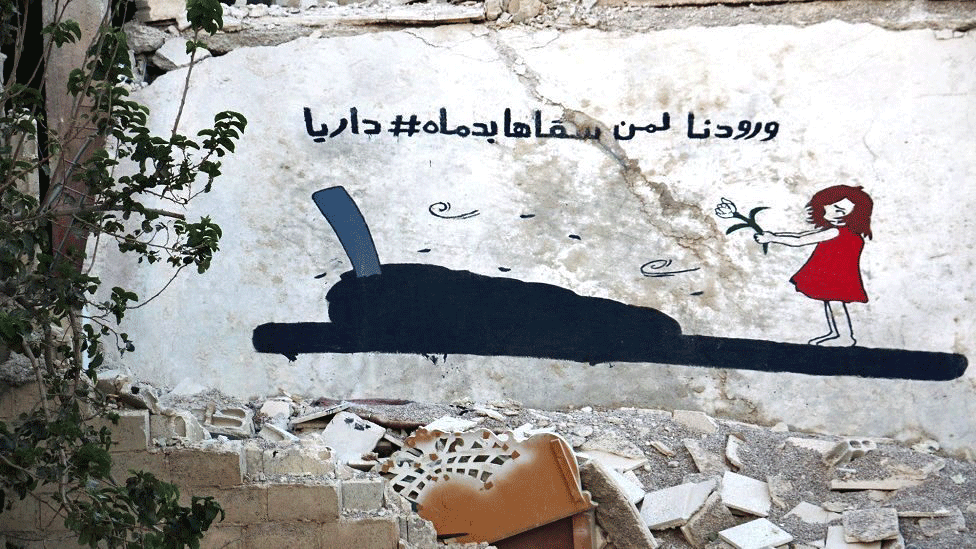 Καθώς ένα προάστιο της Δαμασκού δεχόταν συνεχόμενες βομαβαρδιστικές επιθέσεις και υπέφερε από μια χρόνια έλλειψη τροφίμων, νερού και ηλεκτρικού, εμφανίστηκε ξαφνικά μια επιβλητική τοιχογραφία στον τοίχο ενός βομβαρδισμένου κτηρίου.