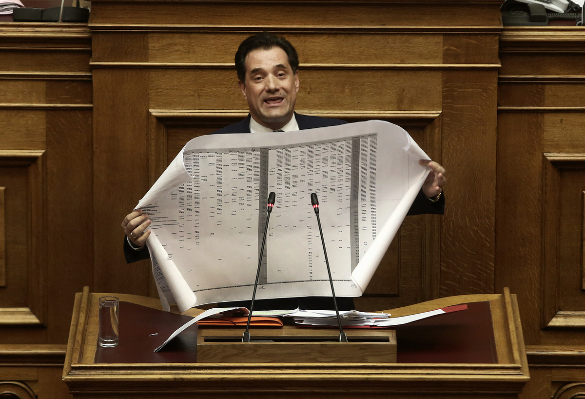 Ο αντιπρόεδρος της ΝΔ Άδωνις Γεωργιάδης μιλάει στη συζήτηση και ψηφοφορία επί της προτάσεως της κυβερνητικής πλειοψηφίας για τη συγκρότηση επιτροπής προκαταρκτικής εξέτασης για την υπόθεση NOVARTIS, στην Ολομέλεια της Βουλής, Τετάρτη 21 Φεβρουαρίου 2018. ΑΠΕ-ΜΠΕ/ΑΠΕ-ΜΠΕ/ΣΥΜΕΛΑ ΠΑΝΤΖΑΡΤΖΗ