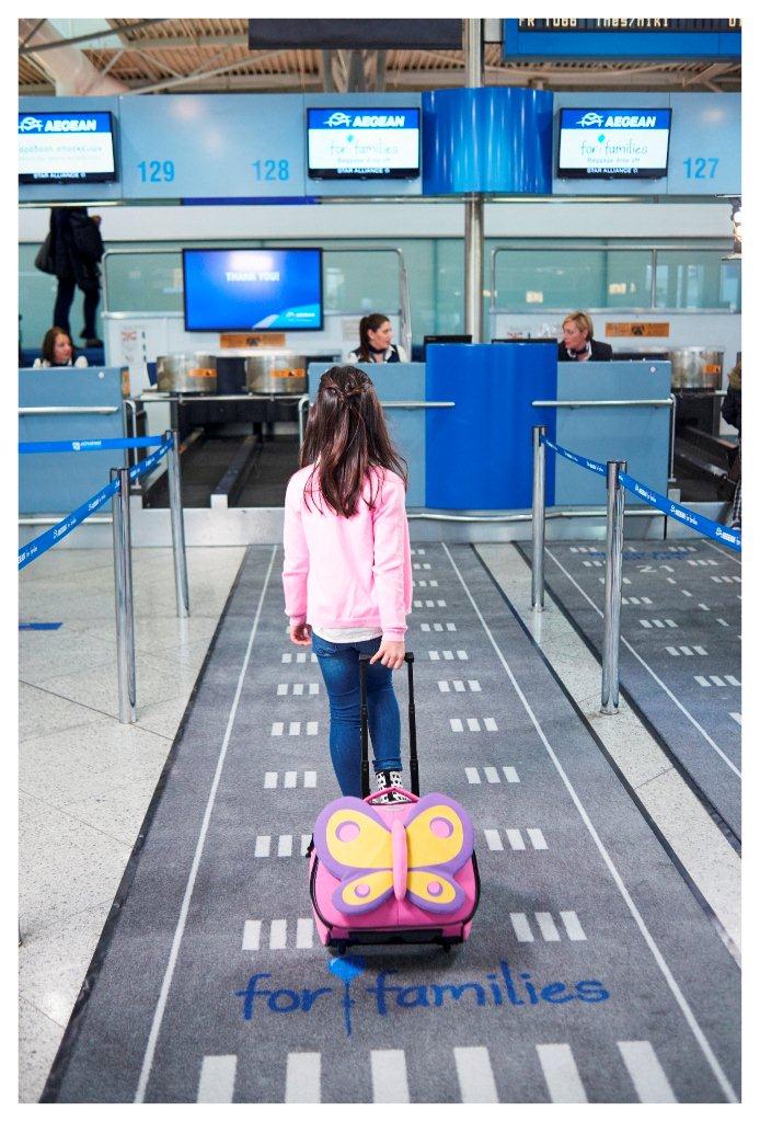 Το οικογενειακό ταξίδι διευκολύνεται όμως ακόμα περισσότερο και στο αεροδρόμιο. Έτσι, στα αεροδρόμια της Αθήνας, Θεσσαλονίκης και Λάρνακας οι οικογένειες μπορούν να παραδίδουν τις αποσκευές τους σε ειδικά σχεδιασμένα counters. Επίσης, δίνεται προτεραιότητα κατά την επιβίβαση των οικογενειών στο αεροσκάφος σε όλες τις πτήσεις της AEGEAN σε όλα τα αεροδρόμια.
