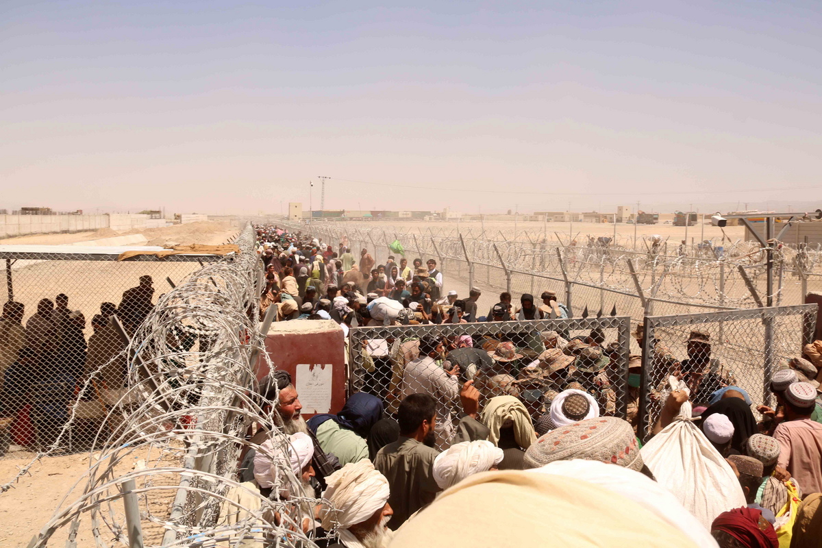 epa09412017 People stranded at the Pakistani-Afghan border wait to cross the border after it was reopened at Chaman, Pakistan, 13 August 2021. Pakistani authorities reopened the border with Afghanistan on 13 August after several days of its closure. Taliban’s shadow governor for Kandahar province had on 05 August issued a statement that announced the closing down of the border with Pakistan at Chaman, and said Islamabad should relax rules for crossing the frontier. EPA/AKHTER GULFAM