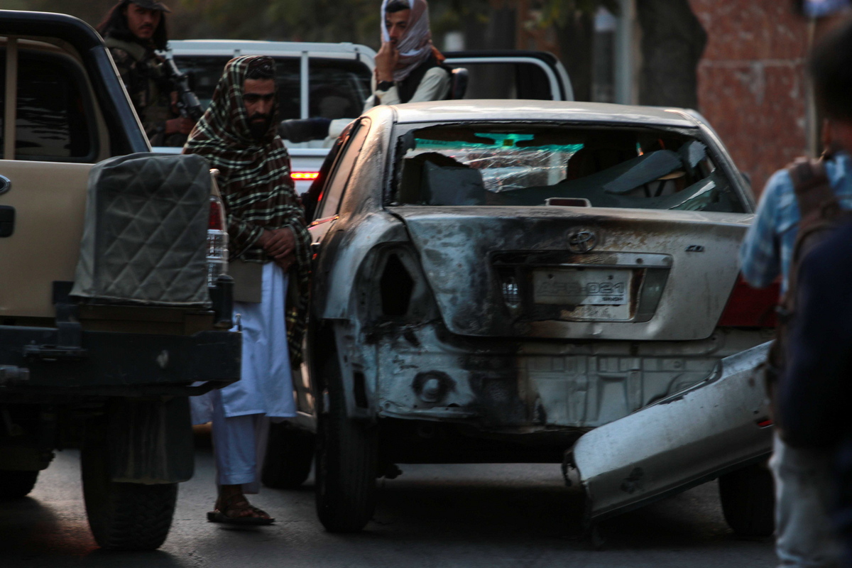 epa09559736 Members of Taliban inspect the scene of bomb blasts, targeting military hospital in Kabul, Afghanistan, 02 November 2021. At least 25 people were killed and an unspecified number wounded on 02 November in a suicide attack with explosives on a military hospital in Kabul. EPA/STRINGER