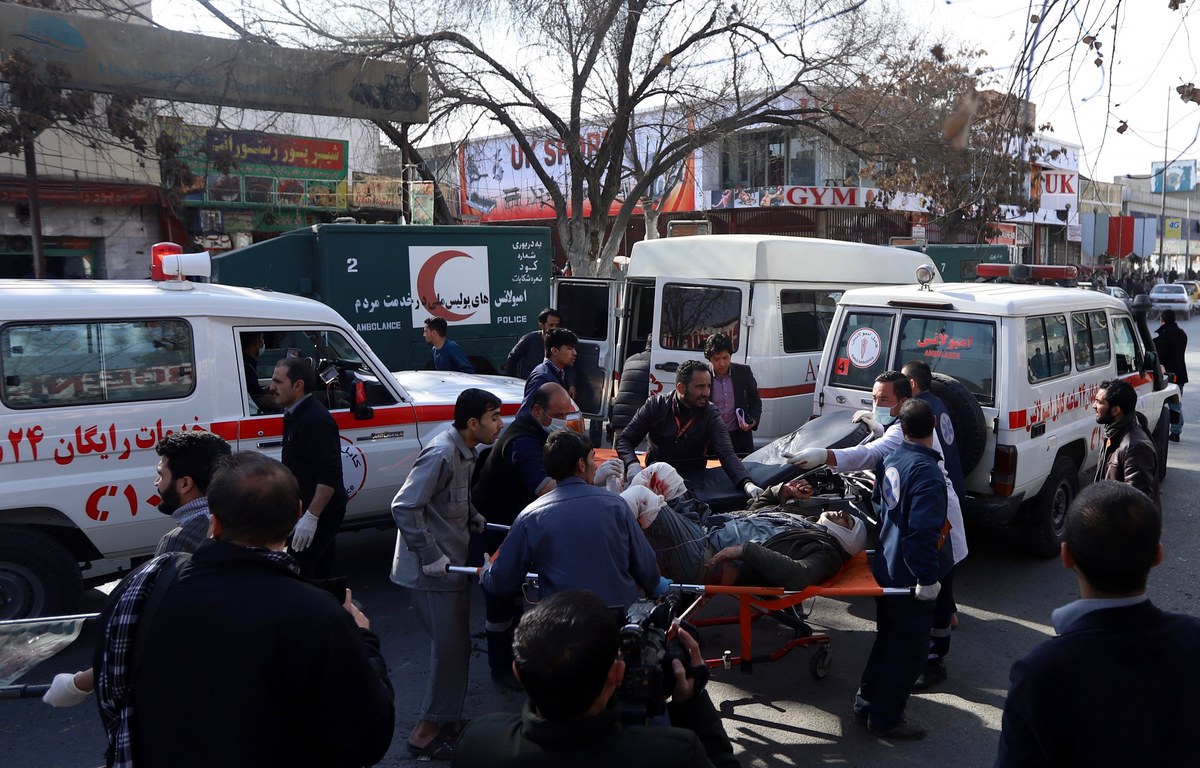 epa06478145 Afghan medics carry people injured in a bomb explosion for medical treatment to a hospital in Kabul, Afghanistan, 27 January 2018. A huge explosion rocked Kabul on 27 January, killing at least 40 people and injuring several dozens. EPA/JAWAD JALALI