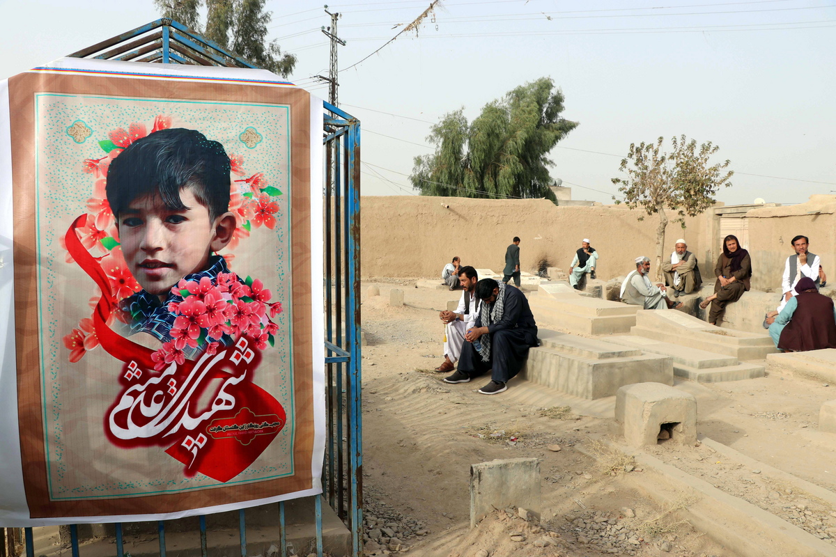 epa09541569 A photo of Ali, the 13-year-old victim who was killed in a bomb blast during Friday prayers at Shiite Muslims Mosque a week earlier, is seen during burial procession in Kandahar, Afghanistan, 23 October 2021. At least 32 people died, and many others suffered injuries in a powerful explosion that ripped through a Shiite mosque on 15 October in the southern Afghan city of Kandahar during Friday prayers. The Islamic State has carried out numerous attacks, in recent years, against the Shia minority, especially the Hazaras. The Taliban have launched massive operations against the Islamic State in different Afghan provinces, aiming to finish a group that they consider the main threat to their government. EPA/STRINGER