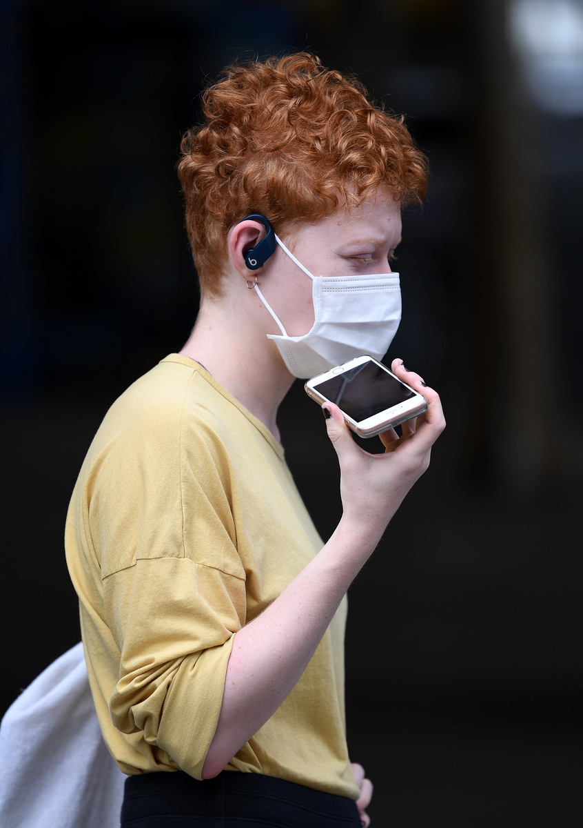 Νεαρή γυναίκα μιλάει στο τηλέφωνό της φορώντας μάσκα προσώπου στο Μπρίσμπεϊν της Αυστραλίας, 27 Μαρτίου 2020. EPA / DAN PELED