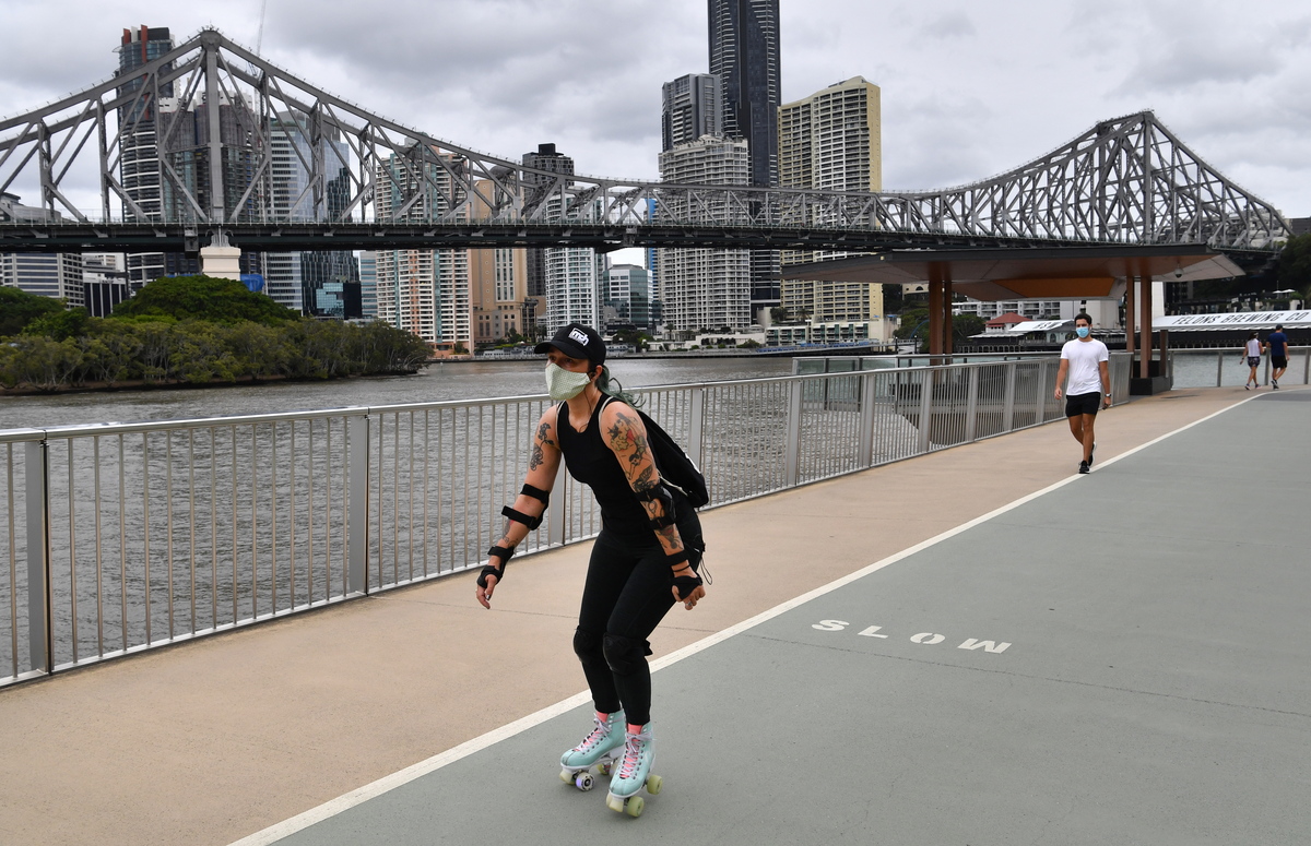 epa08927378 A women on roller-skates is seen exercising along the New Farm Riverwalk in Brisbane, Australia, 09 January 2021. Residents of Greater Brisbane face mandatory lockdown over the weekend in a bid to contain the highly contagious UK variant of COVID-19. EPA/DARREN ENGLAND AUSTRALIA AND NEW ZEALAND OUT