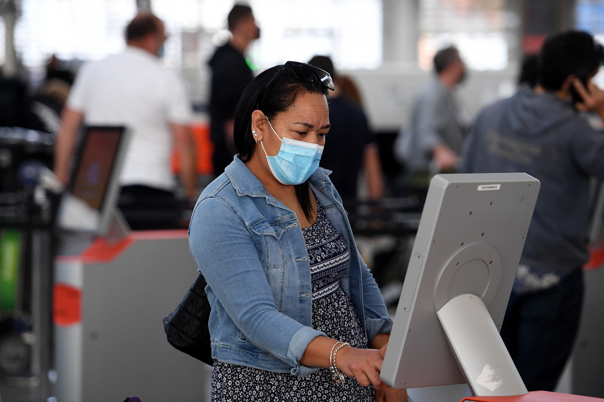 epa09294663 Passengers are seen lining up to check in at Sydney Domestic Airport, in Sydney, New South Wales, Australia, 23 June 2021. New Zealand has stopped quarantine-free travel with New South Wales for at least 72 hours after the Bondi COVID-19 cluster in Sydney's east rose. EPA/DAN HIMBRECHTS AUSTRALIA AND NEW ZEALAND OUT