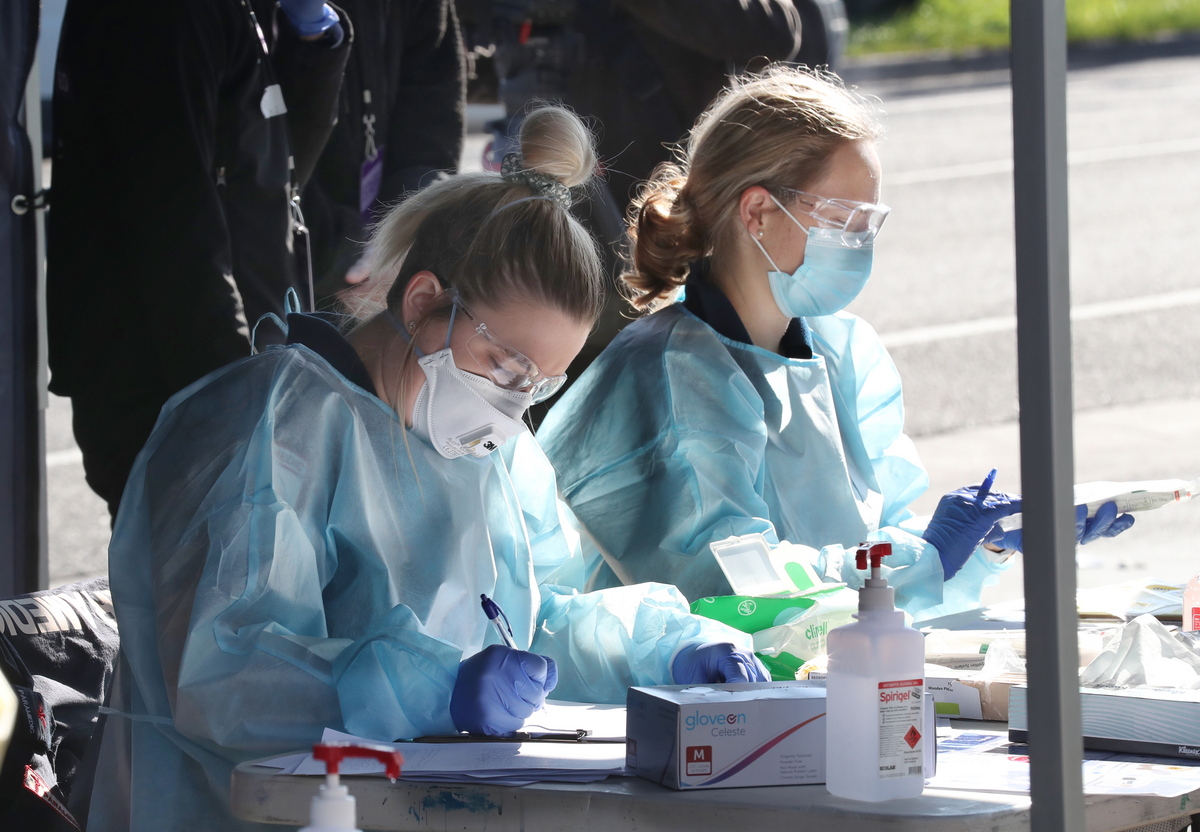 epa08513426 Medical workers collect a swab sample during community COVID-19 testing in Broadmeadows, Melbourne, Australia, 28 June 2020. Victoria has set up virus testing stations in neighbourhoods as it battles community transmission. (AAP Image/David Crosling) NO ARCHIVING EPA/DAVID CROSLING AUSTRALIA AND NEW ZEALAND OUT