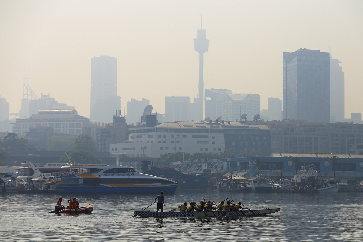 epa07961300 A people row on the water as smoke haze drifts over Sydney, Australia, 31 October 2019. Air quality readings in parts of New South Wales have reached hazardous levels as extensive smoke haze from fires in the state's north is pushed over Sydney. EPA/STEVEN SAPHORE AUSTRALIA AND NEW ZEALAND OUT