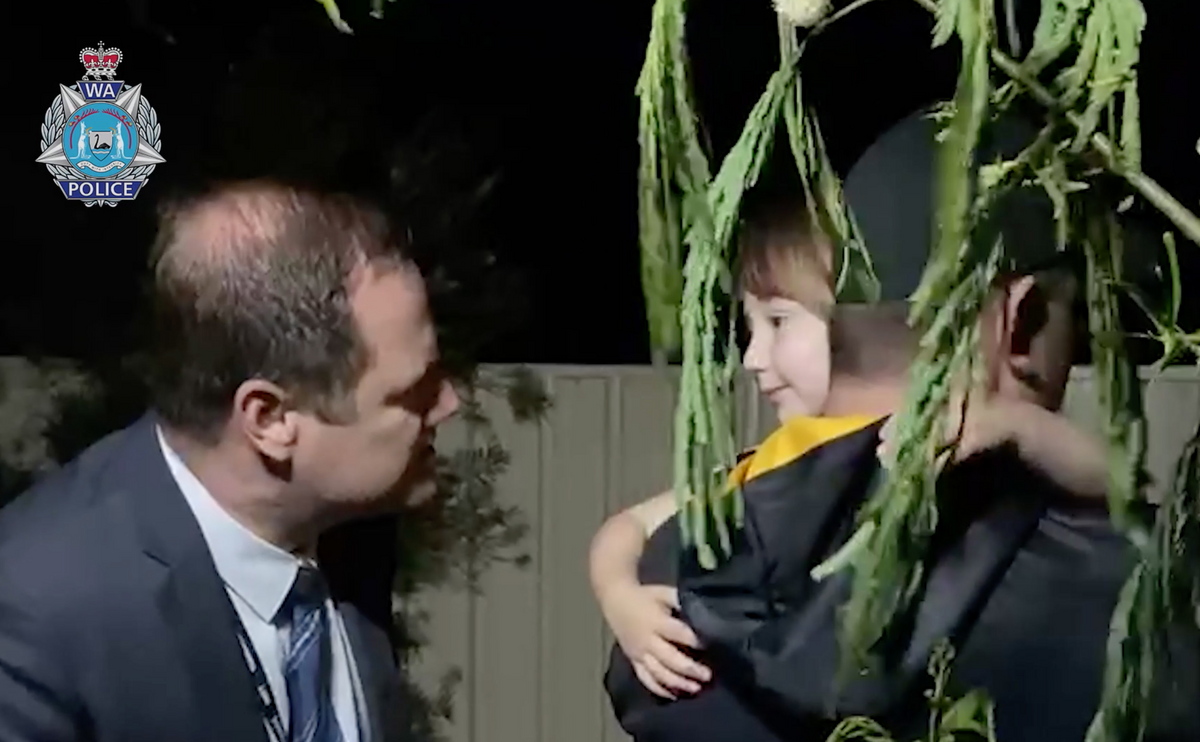 epa09560843 A handout screen grab taken from a police body-worn camera footage made available by Western Australia Police on 03 November 2021, shows four-year-old Cleo Smith being rescued by WA Police including Senior Sergeant Cameron Blaine (L), in Carnarvon, Australia, 03 Novemter 2021. WA police officers discovered missed Cleo alone in a bed in a house in Carnarvon, some 75 kilometres south from where she went missing and just minutes from her family home. EPA/WESTERN AUSTRALIA POLICE / HANDOUT AUSTRALIA AND NEW ZEALAND OUT HANDOUT EDITORIAL USE ONLY/NO SALES