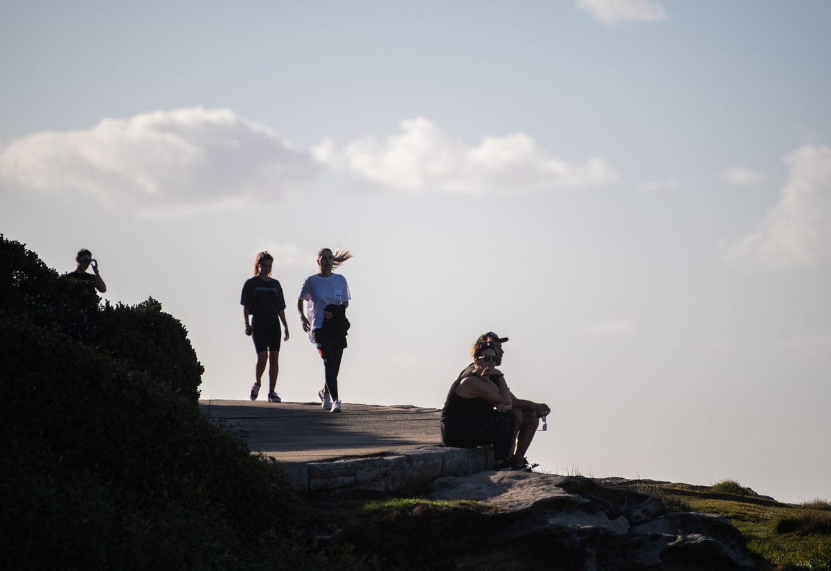 Άνθρωποι απολαμβάνουν τον ήλιο και την θάλασσα σε παράκτιο περίπατο κοντά στην παραλία Bondi στο Σίντνεϊ, Αυστραλία, 28 Μαρτίου 2020. Η Αυστραλία επέβαλε κανόνες κοινωνικής απομάκρυνσης και απαγόρευσε τη συγκέντρωση περισσότερων από 500 ατόμων σε μια προσπάθεια να περιοριστεί η εξάπλωση του κοροναϊού. EPA / JAMES GOURLEY