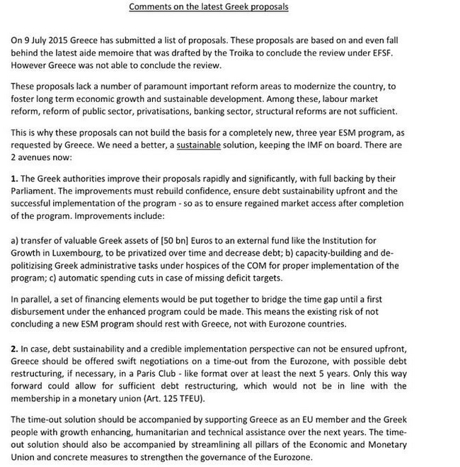 Αυτό είναι το κείμενο της γερμανικής κυβέρνησης, στην οποία το δεύτερο σενάριο προβλέπει την έξοδο («time-out») της Ελλάδας από την Ευρωζώνη για τουλάχιστον πέντε έτη.