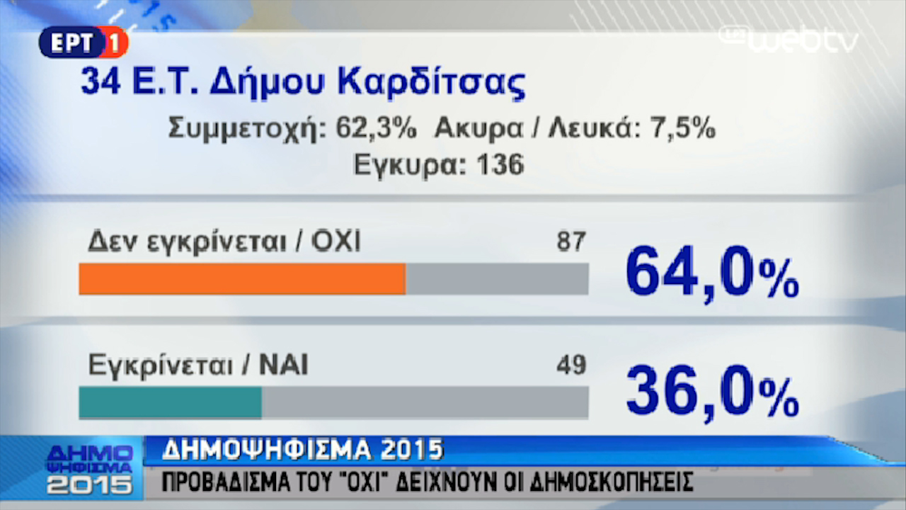 64% το ΌΧΙ και 36% στο ΝΑΙ στο 34 εκλογικό τμήμα του Δήμου Καρδίτσας. Η πρώτη εκτίμηση αποτελέσματος θα έρθει στις 9 το βράδυ.