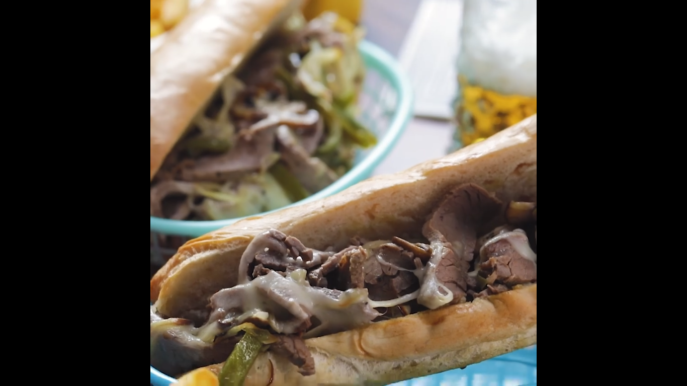 Το παρακάτω βίντεο περιέχει μπριζόλα, μανιτάρια, λιωμένο τυρί, πιπεριές, κρεμμύδια, μουστάρδα και αφράτο ψωμί.