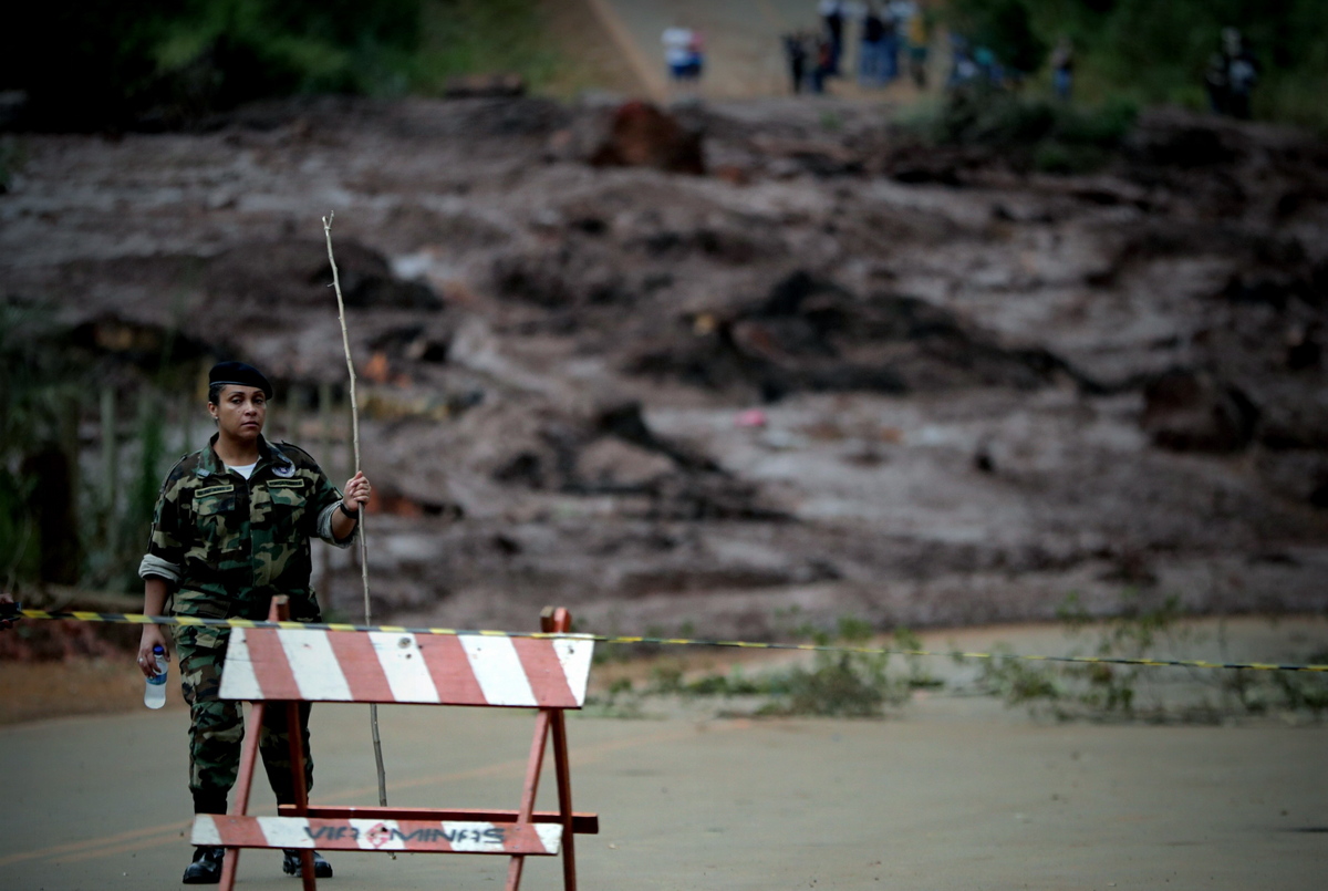 epa07322973 A Brazilian soldier stand guards after the disaster caused by the breakage of a dam containing mineral waste from Vale, in Brumadinho, municipality of Minas Gerais, Brazil, 26 January 2019. At least 34 people have died and 300 are missing after the breakdown of the mining giant Vale's dam in Brazil, firefighters said this Saturday. One of Vale's dams, in an iron mine in the jurisdiction of Brumadinho, municipality of Minas Gerais (southeast), broke down this Friday and a river with mineral residues and mud buried the company's facilities and various homes in rural areas. EPA/Antonio Lacerda