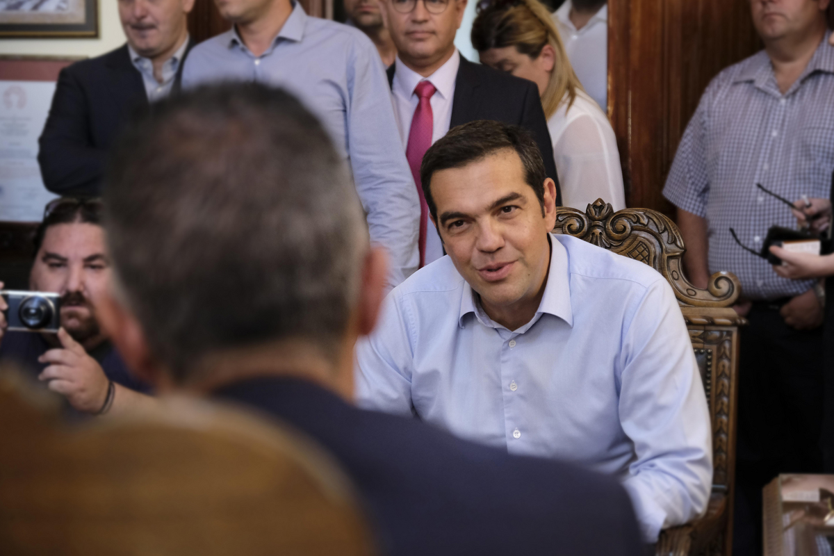 (Ξένη Δημοσίευση) Ο πρωθυπουργός Αλέξης Τσίπρας (Δ) συναντήθηκε με τον Δήμαρχο Σύρου - Ερμούπολης Γιώργο Μαραγκό (Α), στο Δημαρχείο Ερμούπολης, Παρασκευή 24 Αυγούστου 2018. Ο πρωθυπουργός Αλέξης Τσίπρας θα συναντηθεί με τον δήμαρχο του νησιού και θα απευθύνει ομιλία στους εργαζόμενους του Νεώριου. ΑΠΕ-ΜΠΕ/ΓΡΑΦΕΙΟ ΤΥΠΟΥ ΠΡΩΘΥΠΟΥΡΓΟΥ/Andrea Bonetti