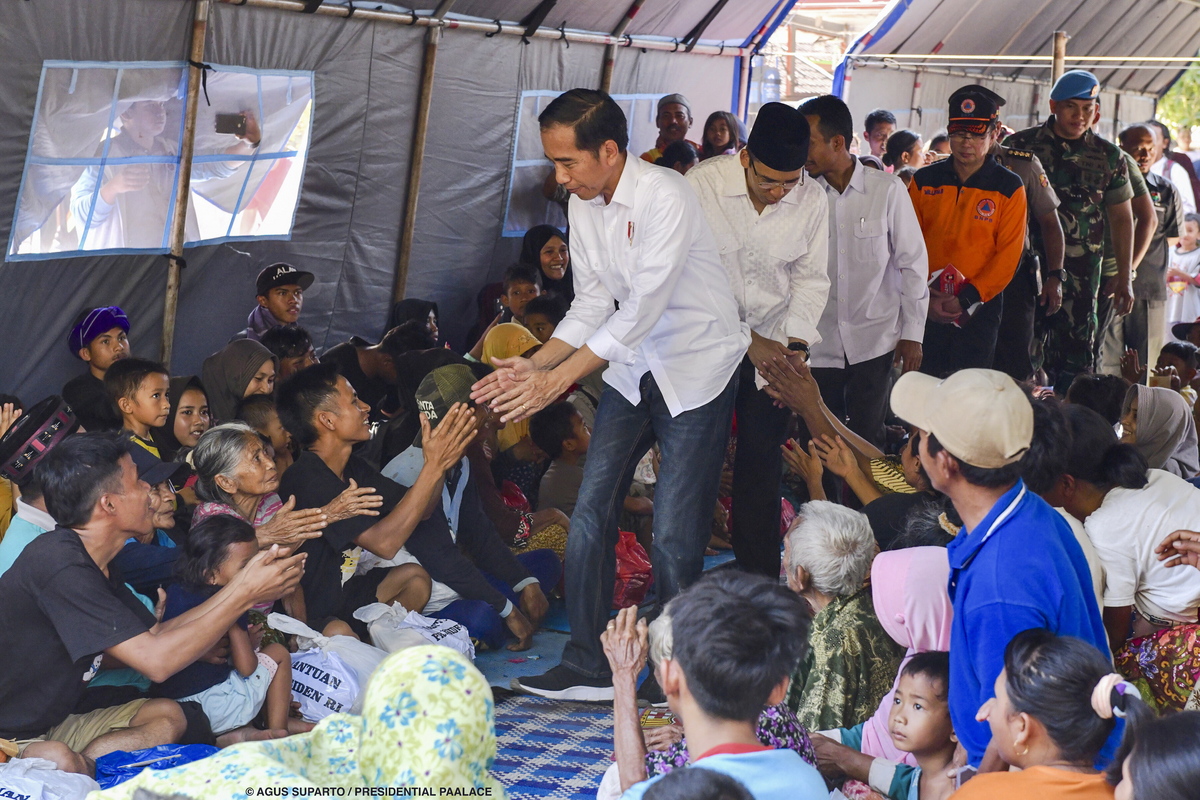 epa06918449 A handout photo made available by Indonesian Presidential Palace shows Indonesian President Joko Widodo greeting villagers at an emergency shelter for the earthquake survivors in Lombok, West Nusa Tenggara province, Indonesia, 30 July 2018. Rescue workers attempted to evacuate hundreds of stranded climbers on mount Rinjani, a day after the 6.4 earthquake struck the island killing at least 14 people. EPA/AGUS SUPARTO/PRESIDENTIAL PALACE HANDOUT HANDOUT EDITORIAL USE ONLY/NO SALES