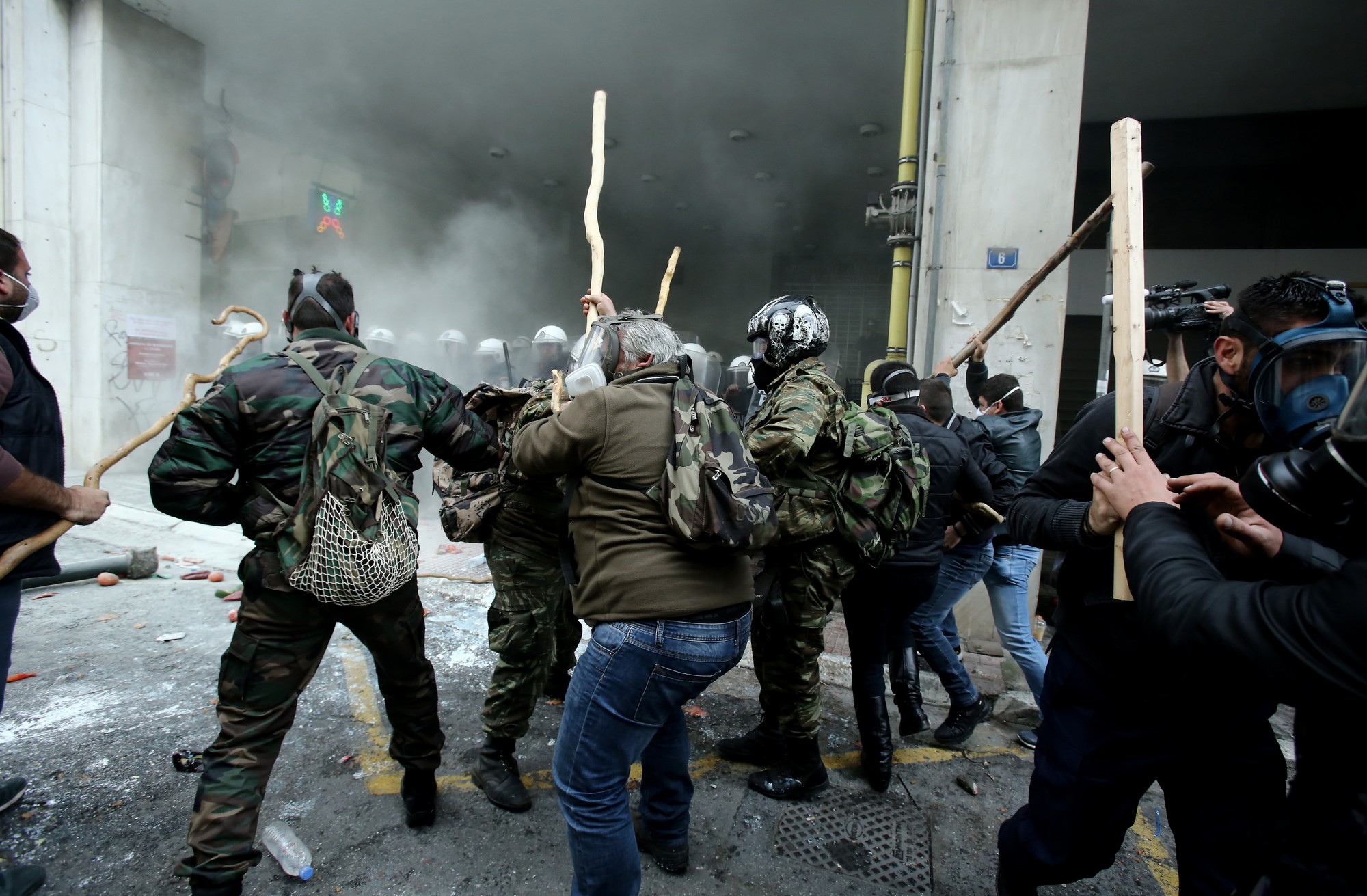 Όπως θα δείτε και στις φωτογραφίες ήταν μεγάλη η ένταση το πρωί έξω από το Υπουργείο Αγροτικής Ανάπτυξης όπου είχαν μαζευτεί αγρότες από την Κρήτη. Τα πράγματα αγρίεψαν όταν έγινε γνωστό ότι οι αστυνομικές δυνάμεις συνέλαβαν έναν συνάδελφο τους. Άρχισαν τότε να εκτοξεύουν πέτρες, σπάζοντας όλα τα τζάμια του πρώτου ορόφου με αποτέλεσμα να τραυματιστεί μια υπάλληλος που εργάζεται στο πρωτόκολλο του υπουργείου. Οι υπάλληλοι τρομοκρατημένοι ζήτησαν να φύγουν.