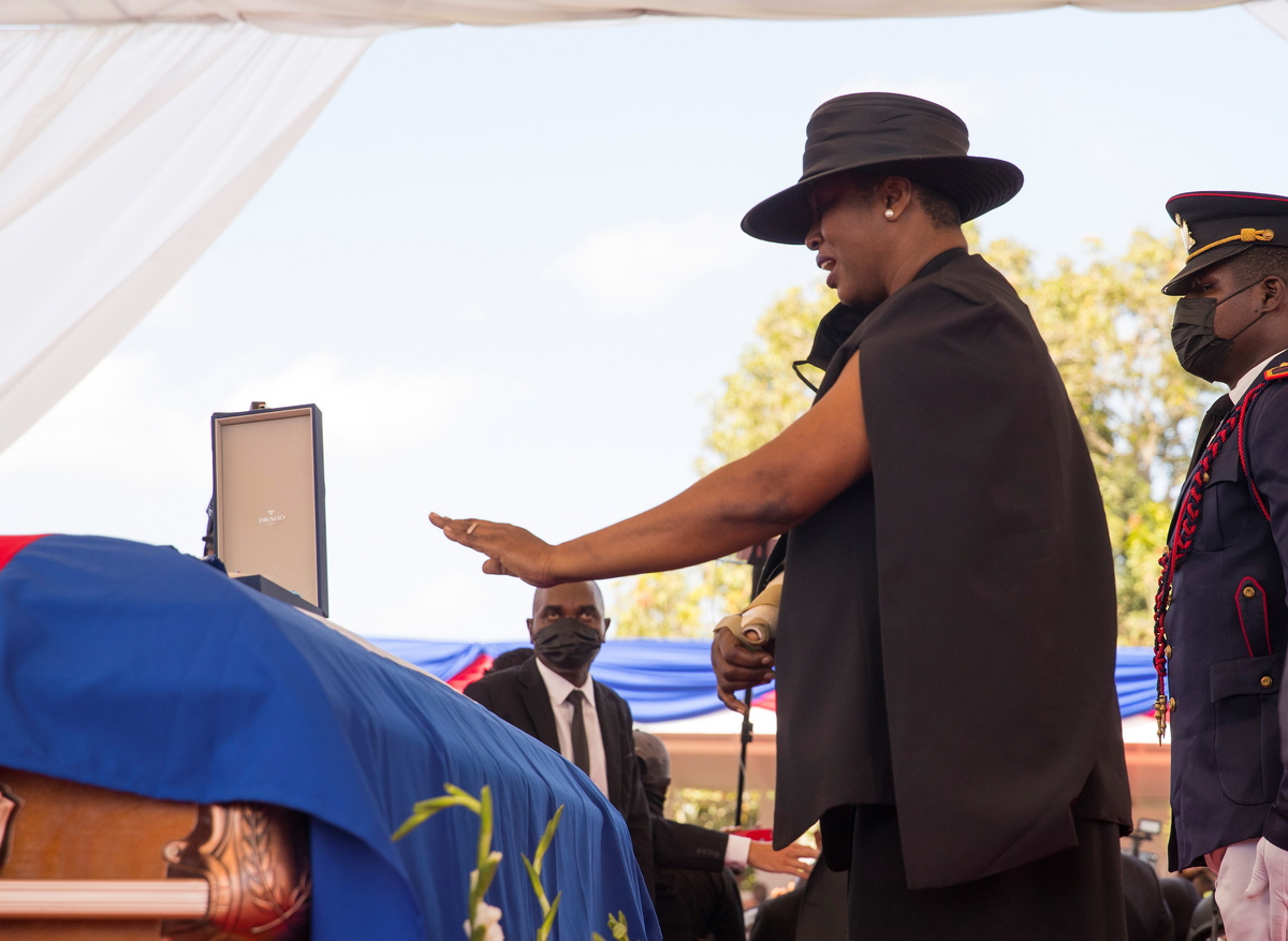 epa09360423 Haiti's first lady, Martine Moise, bids farewell to her husband, President Jovenel Moise in Cap-Haitien, Haiti, 23 July 2021. The wake in honor of the president of Haiti, Jovenel Moise, began on 23 July in the city of Cap-Haitien, in the north of the country, hours before the burial of the president, who was assassinated on 07 July 2021, takes place. The funeral service began two hours behind schedule and takes place in the gardens of the Habitation Village SOS, the Moise family's private residence on the outskirts of Cap-Haitien, which is guarded by a strong security apparatus. EPA/Orlando Barria