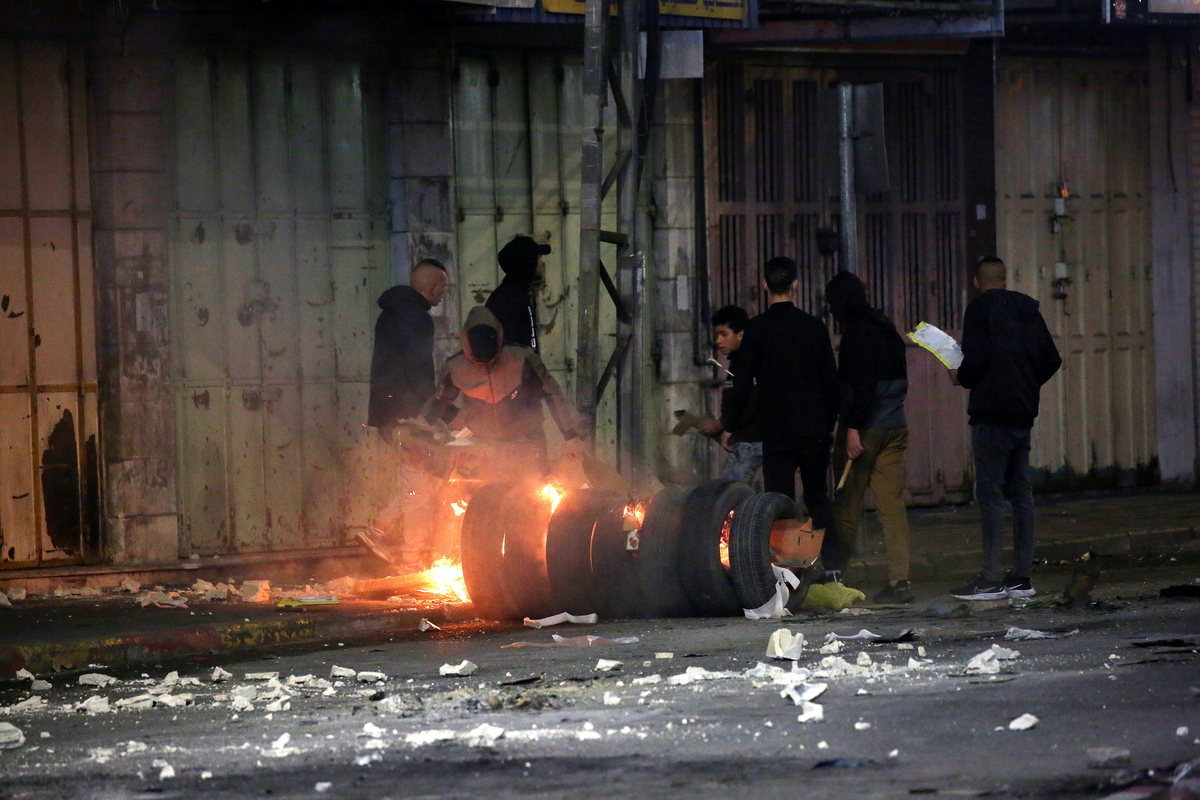 epa09888922 Palestinian protesters burn tires during clashes with Israeli forces in the West Bank city of Hebron, 14 April 2022. According to Palestinian medical sources, 14 year-old Qusai Al Hamamrah was killed during clashes with Israeli forces conducting raids in Husan, near Bethlehem. EPA/ABED AL HASHLAMOUN