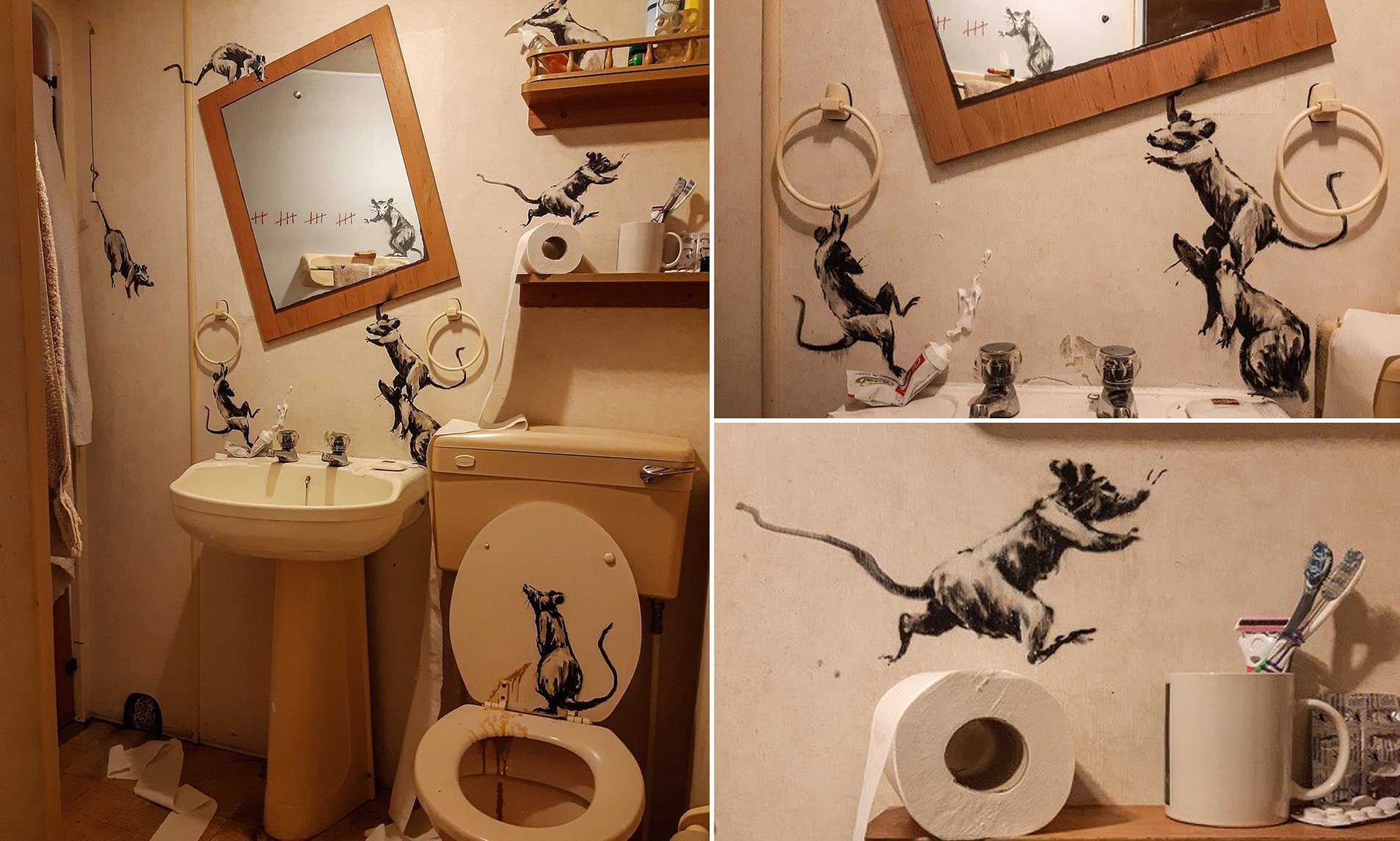 Πριν λίγο, ανήρτησε στον λογαριασμό του στο Instagram φωτογραφίες του καινούργιου δημιουργήματός του: μια αγέλη σκανταλιάρηδων αρουραίων – είναι, άλλωστε και το καλλιτεχνικό σήμα κατατεθέν του – κάνει το μπάνιο μαντάρα. Κάνουν κούνια στους μεταλλικούς κρίκους όπου κρεμάμε τις πετσέτες, τρέχουν πάνω σε ρολά χαρτιού υγείας, κρατάνε σημειώσεις για τις μέρες που περνούν με μαρκαδόρο στους τοίχους και κάνουν τη λεκάνη της τουαλέτας μια σιχαμερή αηδία.