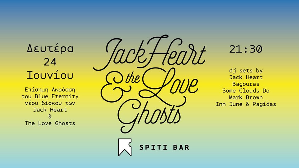 Ο δίσκος των Jack Heart & The Love Ghosts – Blue Eternity μόλις κυκλοφόρησε από την Blackspin Records και την Primitive Music και θα το γιορτάσουν στο αγαπημένο τους Spiti Bar ακούγοντας όλο το νέο δίσκο , θα μοιραστούν ιστορίες από την ηχογράφηση του και θα διαλέξουν παράξενες μουσικές για όλα τα γούστα.