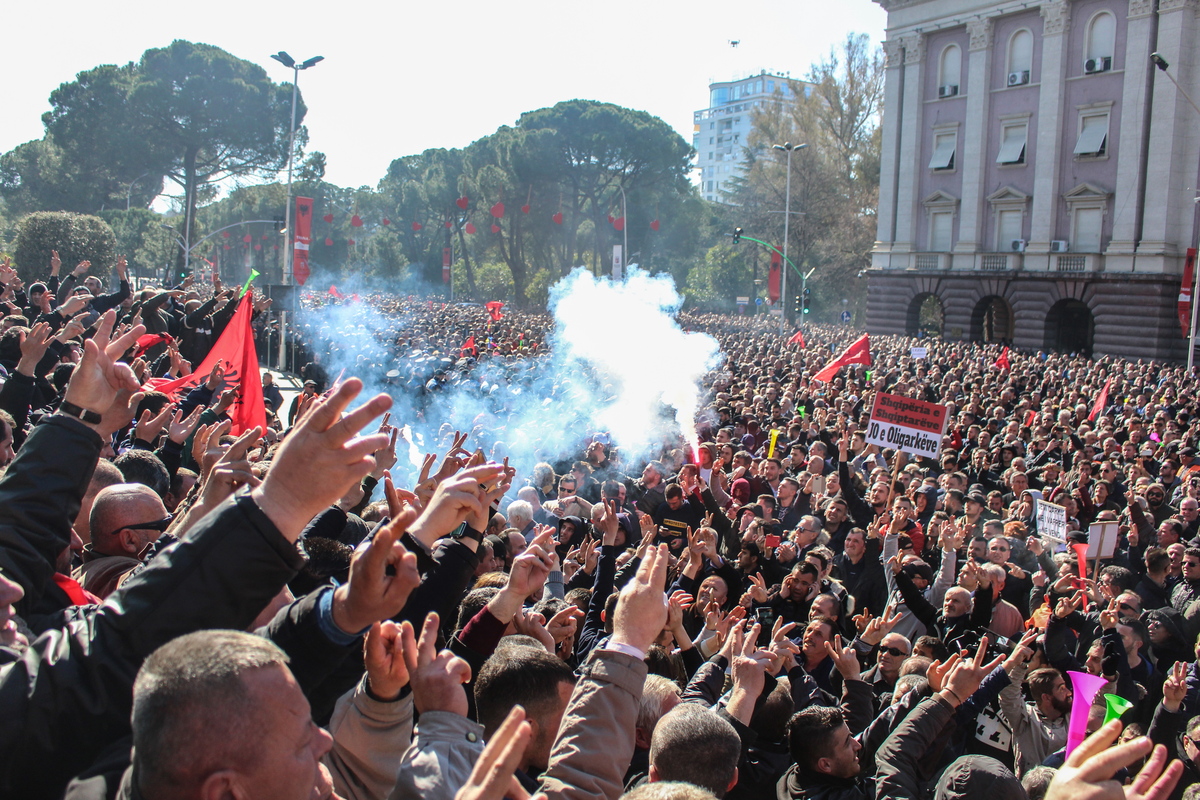 epa07374408 Police throw tear gas as supporters of Albanian opposition shout anti Government slogans during a protest in front of government building in Tirana, Albania, 16 February 2019. Reports state that they are demanding the resignation of the Albanian Prime Minister Edi Rama accusing him of alleged corruption and vote buying. EPA/MALTON DIBRA