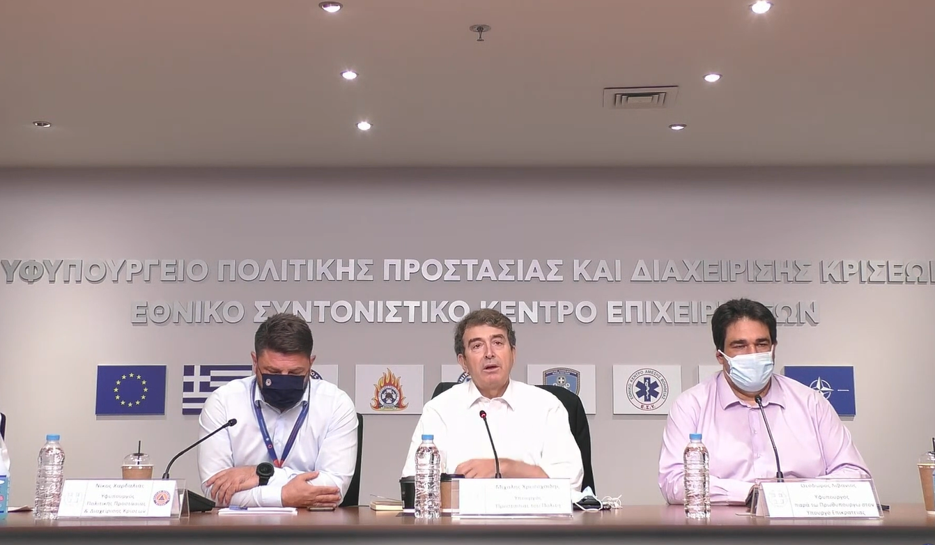 Ο υπουργός Προστασίας του Πολίτη Μιχάλης Χρυσοχοΐδης τόνισε ότι όλοι μαζί, κράτος, τοπική αυτοδιοίκηση, θα συνεργαστούμε για να προλάβουμε δυσάρεστες καταστάσεις. Όπως είπε, το έργο τους θα κινηθεί σε τέσσερις άξονες, την αυξημένη ετοιμότητα για αποτροπή και πρόληψη πυρκαγιών, την αδιάλειπτη λειτουργία κρίσιμων υποδομών, την παροχή υπηρεσιών σε ευπαθείς ομάδες που θα αναζητήσουν στέγη και περίθαλψη καθώς και την προστασία των εργαζομένων. Ο κ. Χρυσοχοΐδης κάλεσε τους πολίτες να αποφύγουν οποιαδήποτε περιττή δραστηριότητα που μπορεί να προκαλέσει πυρκαγιά, ενώ διεμήνυσε ότι η Πολιτική Προστασία, η αστυνομία, η Πυροσβεστική θα είναι σε ετοιμότητα και επιφυλακή μέσω περιπολιών που θα γίνονται για την αποφυγή πυρκαγιών και για τον εντοπισμό σημείων που μπορεί να δημιουργηθεί πρόβλημα ώστε να υπάρξει άμεση παρέμβαση. Παράλληλα επισήμανε ότι τοπική αυτοδιοίκηση θα βρίσκεται σε κατάσταση ετοιμότητας ενώ ανέφερε ότι θα γίνουν ανακοινώσεις από το υπουργείο Εργασίας για τα μέτρα προστασίας των εργαζομένων που πρόκειται να ληφθούν.