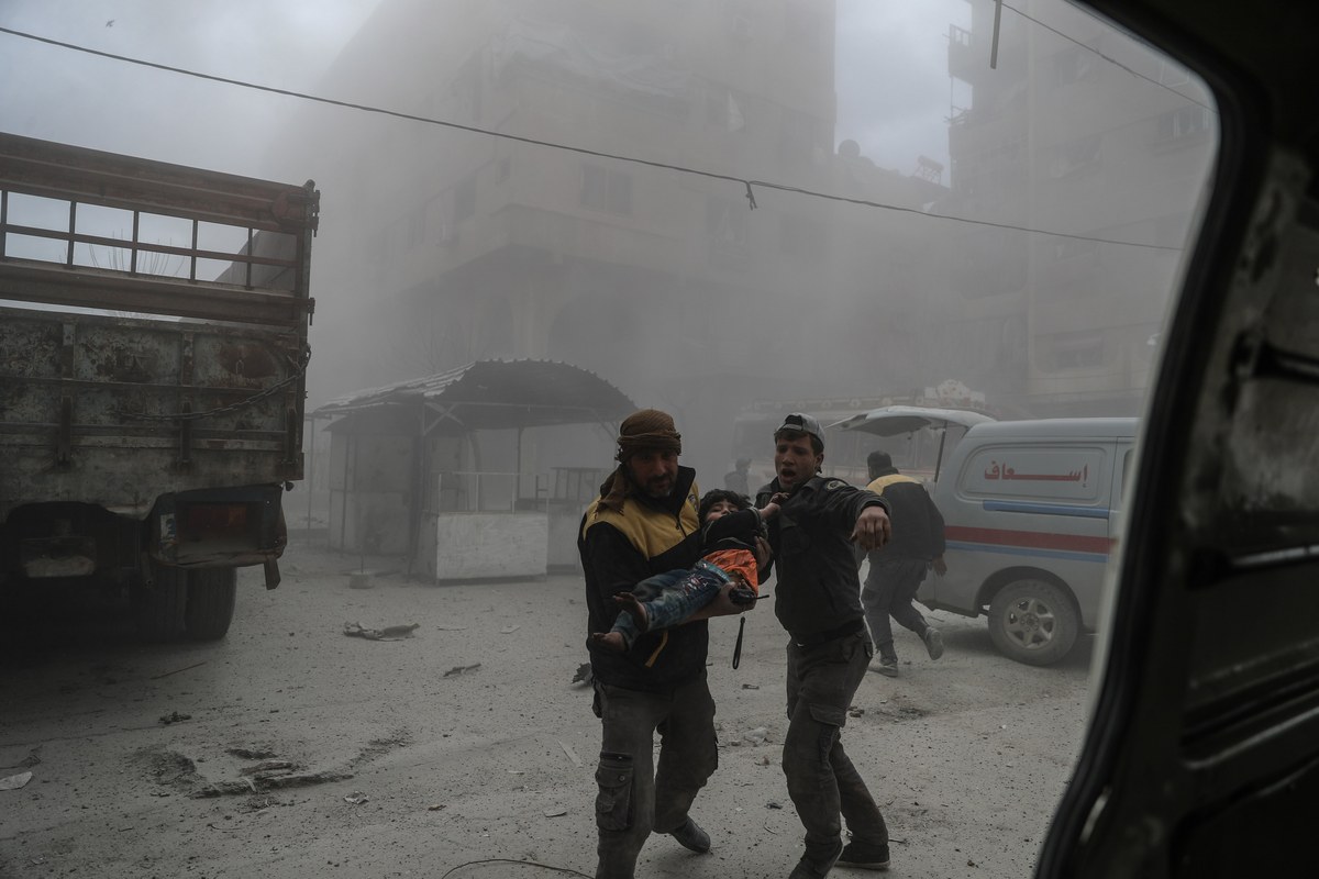 epa06555678 White helmet volunteer carries an injured boy to an ambulance after bombing, in the rebel-held Douma, Eastern Ghouta, Syria, 22 February 2018. More than 42 people got killed in Douma after several airstrikes and shelling by forces allegedly loyal to the Syrian Government. At least 80 people got killed in Eastern Ghouta on the same day, according to local sources. EPA/MOHAMMED BADRA