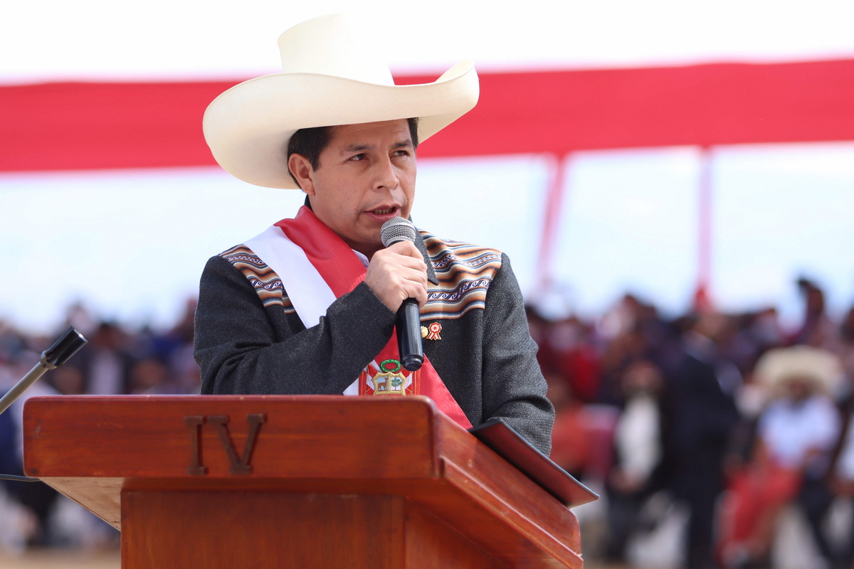 epa09377603 A handout photo made available by Peru's Presidency shows the recently invested President Pedro Castillo during a symbolic swearing-in ceremony to his position, in the Pampa de la Quinua, in Ayucucho, Peru, 29 July 2021. The President of Peru Pedro Castillo participated this 29 July as 'President of the Bicentennial' in a symbolic swearing-in ceremony in the Pampa de La Quinua, where the Battle of Ayacucho took place, which sealed Peruvian independence. EPA/Presidency of Peru HANDOUT ONLY AVAILABLE TO ILLUSTRATE THE ACCOMPANYING NEWS (MANDATORY CREDIT) HANDOUT EDITORIAL USE ONLY/NO SALES