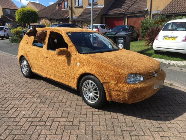 A chauffeur got so fed up with driving luxury vehicles that he bought himself this £200 runaround - and covered it in FUR. Justin Scrutton, the owner of a chauffeur company, bought the wrecked old Volkswagen Golf because he fancied driving something that he didn't mind if his two dogs ruined. See National News story NNCAR; But the 46-year-old decided to go one step further and spent a barmy £180 covering the ancient Golf in ten metres of teddy-bear fabric. Justin, from Dartford, Kent said: I was trying to sleep one night and for some crazy reason I thought why not?