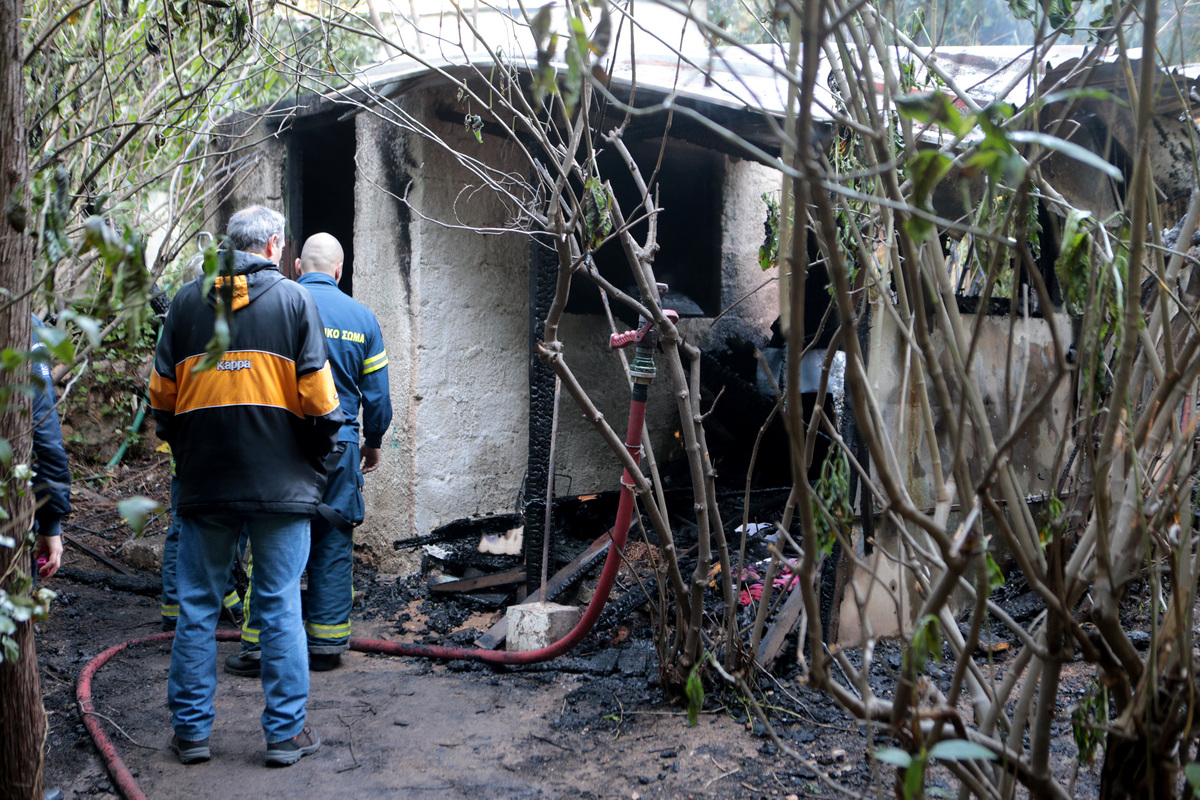 Πυροσβέστες και αστυνομικοί εξετάζουν αποθήκη στον Κολωνό στην οποία εκδηλώθηκε πυρκαγιά το πρωί , Τρίτη 13 Φεβρουαρίου 2018. Ένας νεκρός άνδρας εντοπίστηκε σε αποθήκη που τυλίχθηκε στις φλόγες σε πάρκο στη συμβολή των οδών Ιωαννίνων και Καπανέως στον Κολωνό. ΑΠΕ-ΜΠΕ/ΑΠΕ-ΜΠΕ/Παντελής Σαίτας