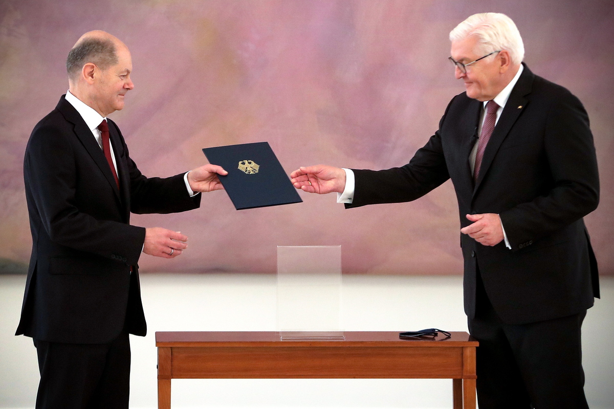 epa09629053 Newly appointed German Chancellor Olaf Scholz (L) receives his certificate of German President Frank-Walter Steinmeier (R) during the appointment of the Federal Chancellor at the Bellevue Palace in Berlin, Germany, 08 December 2021. A coalition of Social Democratic Party (SPD), Green party (Die Gruenen) and Free Democratic Party (FDP) forms the new German government. EPA/MARTIN DIVISEK