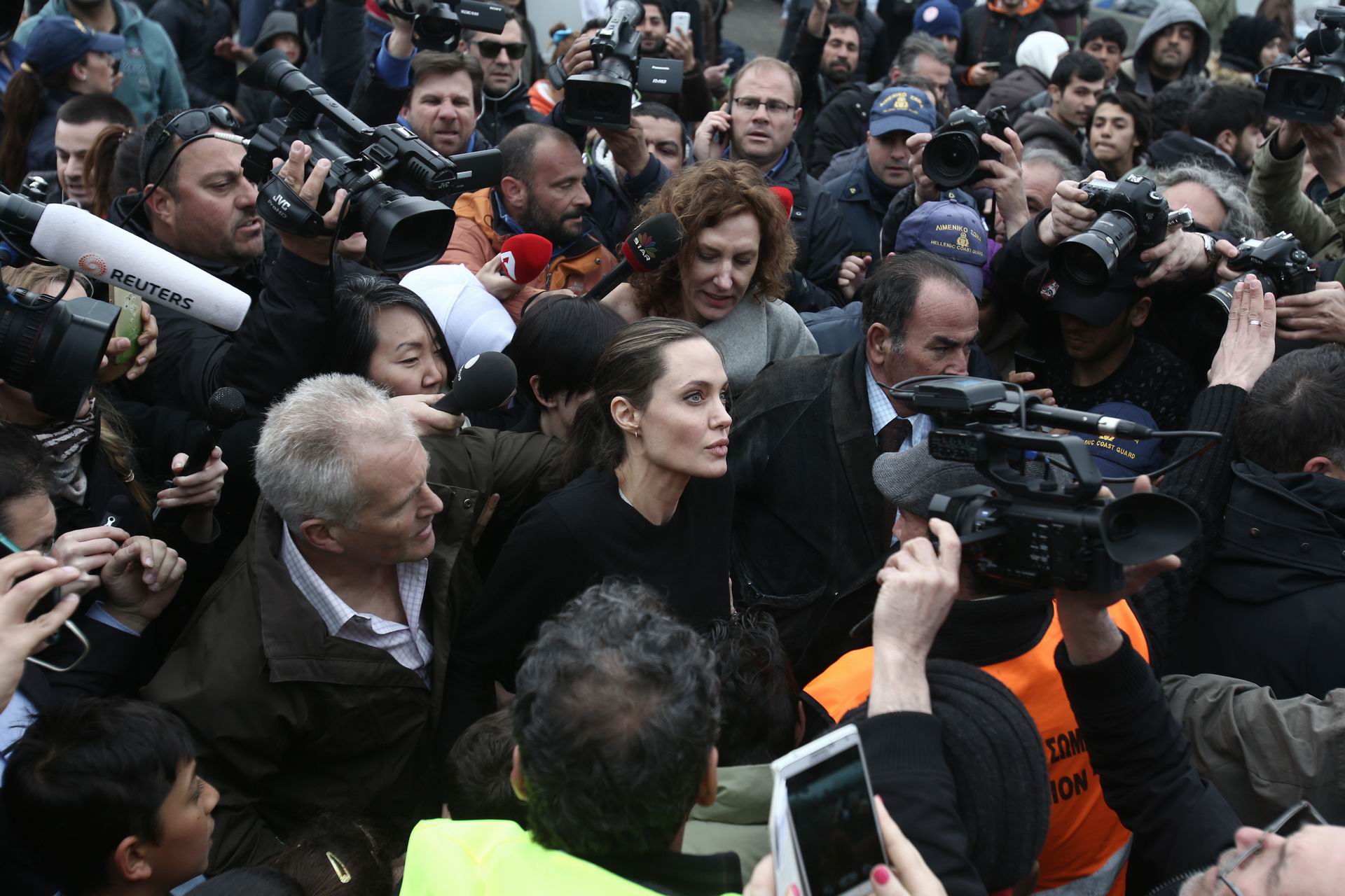 Αμέτρητοι οι φωτορεπόρτερ, οι δημοσιογράφοι και τα τηλεοπτικά κανάλια γύρω από την Αμερικανίδα ηθοποιό και πρέσβειρα καλής θελήσεως του ΟΗΕ, Αντζελίνα Τζολί. Η κυρία Τζολί επισκέφθηκε τα καταλύματα των προσφύγων, που έχουν δημιουργηθεί πρόχειρα στο λιμάνι του Πειραιά. Τετάρτη 16 Μαρτίου 2016.