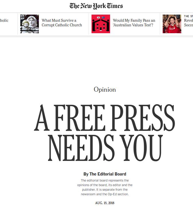 Περισσότεροι από 300 δημοσιογραφικοί οργανισμοί στις ΗΠΑ αφιερώνουν σήμερα τα κύρια άρθρα τους σε εκστρατεία υπέρ της ελευθεροτυπίας με αφορμή της επιθέσεις του Ντόναλντ Τραμπ κατά του Τύπου.