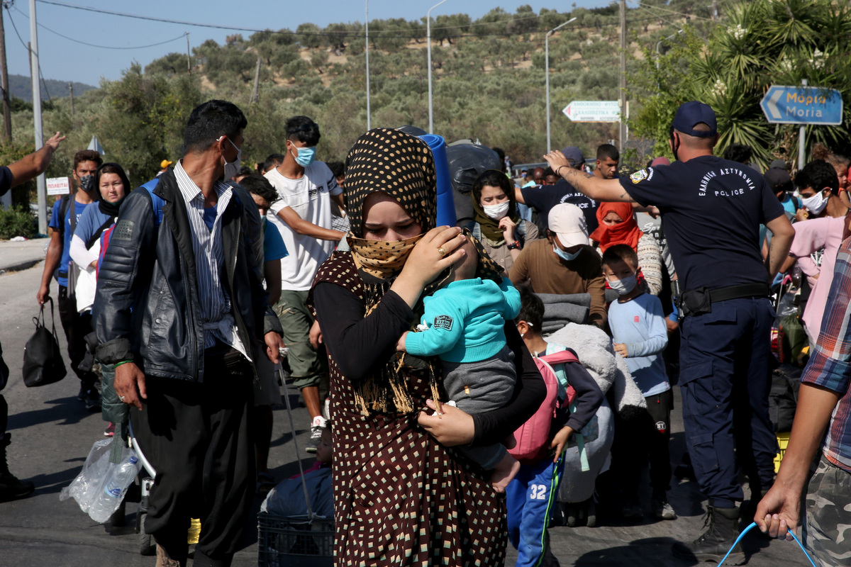 Πρόσφυγες και μετανάστες περπατάνε σε δρόμο στην Μυτιλήνη μετά τις καταστροφικές φωτιές των τριών προηγούμενων ημερών που κατέστρεψαν ολοσχερώς το Κέντρο Υποδοχής και Ταυτοποίησης προσφύγων και μεταναστών στη Μόρια, Παρασκευή 11 Σεπτεμβρίου 2020. ΑΠΕ-ΜΠΕ/ΑΠΕ-ΜΠΕ/ ΟΡΕΣΤΗΣ ΠΑΝΑΓΙΩΤΟΥ