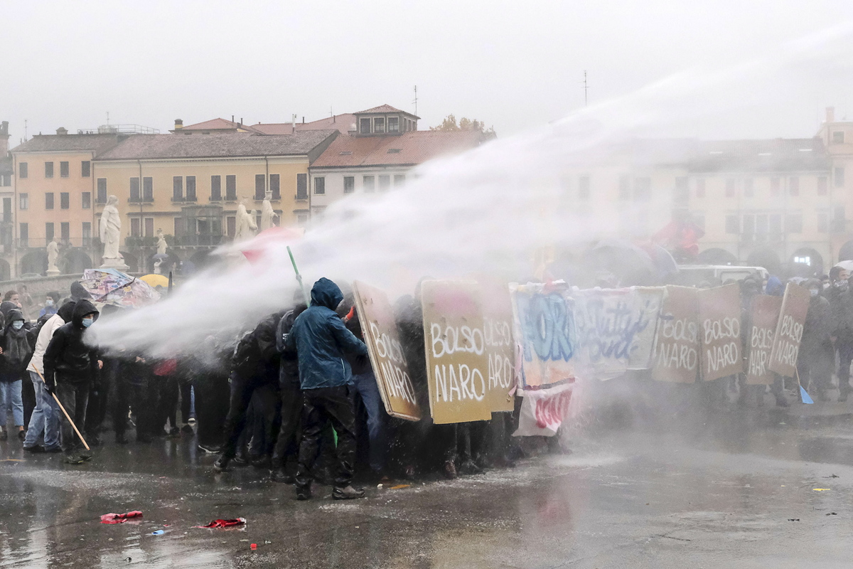 epa09558238 Italian police charge demonstrators who want to prevent the President of Brazil, Jair Bolsonaro, to enter the Basilica of the Saint, in Padova, Italy, 01 November 2021. The visit has been cancelled, at least for the moment. EPA/NICOLA FOSSELLA