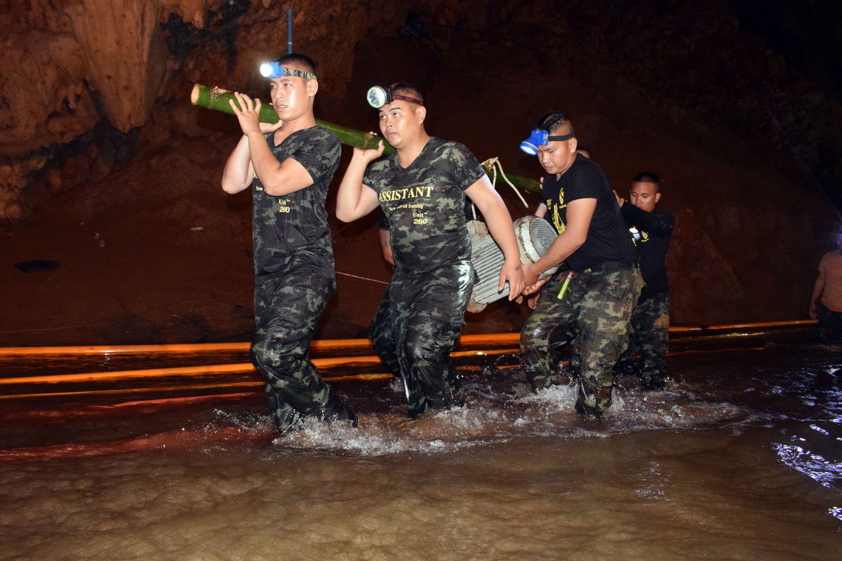 epa06858276 An undated handout photo released by Royal Thai Army on 02 July 2018 shows Thai soldiers carrying equipment inside the flooded cave complex during a rescue operation for a missing youth soccer team and their coach at Tham Luang cave in Khun Nam Nang Non Forest Park, Chiang Rai province, Thailand. Rescuers are attempting to pump water out of a cave complex in an effort to continue the rescue of 13 young members of a youth soccer team including their coach that are believed to have been trapped in the flooded cave complex since 23 June 2018. EPA/ROYAL THAI ARMY HANDOUT EDITORIAL USE ONLY/ NO SALES HANDOUT EDITORIAL USE ONLY/NO SALES