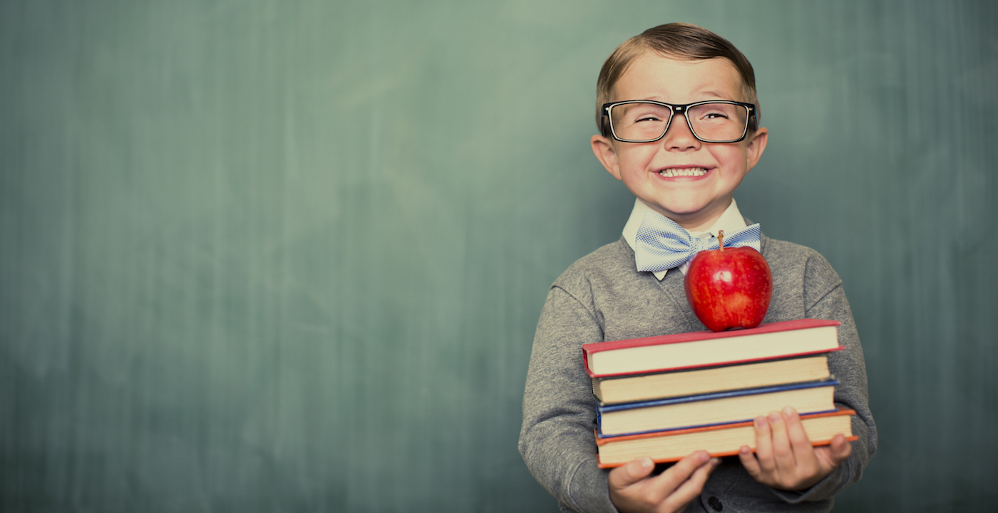 A young and vintage student is ready to learn at school. First, he will give his teacher an apple.