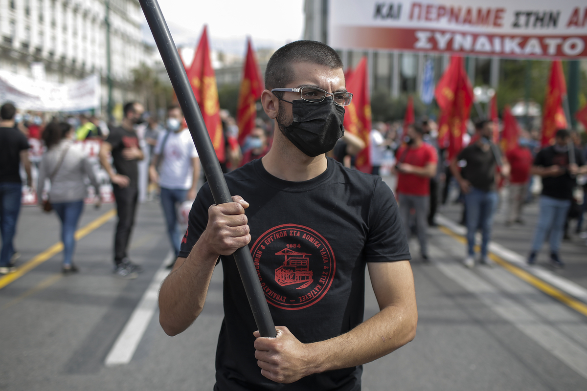 Εργάτες και συνδικαλιστές εργατικών σωματείων συμμετέχουν σε συγκέντρωση του ΠΑΜΕ για την 24ωρη πανελλαδική απεργία και την Εργατική Πρωτομαγιά, στην πλατεία Συντάγματος, Αθήνα, Πέμπτη 6 Μαΐου 2021. ΑΠΕ-ΜΠΕ/ΑΠΕ-ΜΠΕ/ΚΩΣΤΑΣ ΤΣΙΡΩΝΗΣ