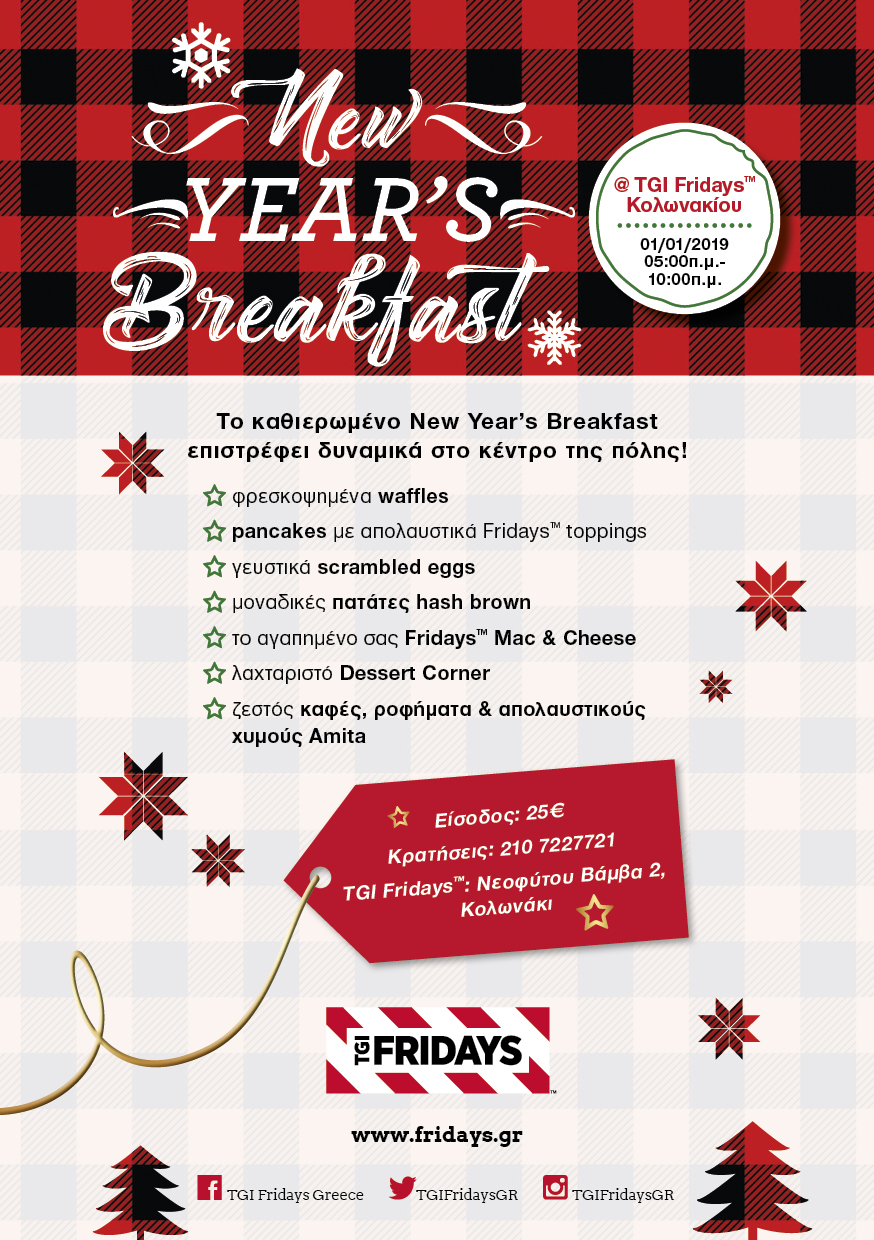 Απολαύστε όλα όσα ονειρεύεστε από ένα New Year’s Breakfast στοTGI Fridays™ Κολωνακίου με την υπογραφή και την υποστήριξη των ΙΚΕΑ, Amita, Philadelphia, Creta Farm, Douwe Egberts, Kayak και American Eagle.