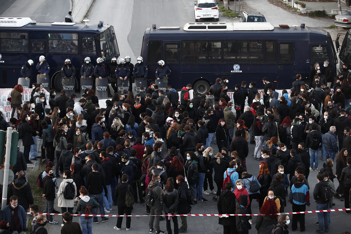 Αστυνομικοί προσαγάγουν διαδηλωτή κατά τη διάρκεια της κατάληψης του κτιρίου της διοίκησης του Αριστοτελείου Πανεπιστημίου Θεσσαλονίκης (ΑΠΘ), Δευτέρα 22 Φεβρουαρίου 2021. Οι φοιτητικές παρατάξεις αντιδρούν στις διατάξεις του νομοσχεδίου που αφορούν την ίδρυση ομάδας πανεπιστημιακής αστυνομίας. ΑΠΕ-ΜΠΕ / ΑΠΕ-ΜΠΕ / ΔΗΜΗΤΡΗΣ ΤΟΣΙΔΗΣ