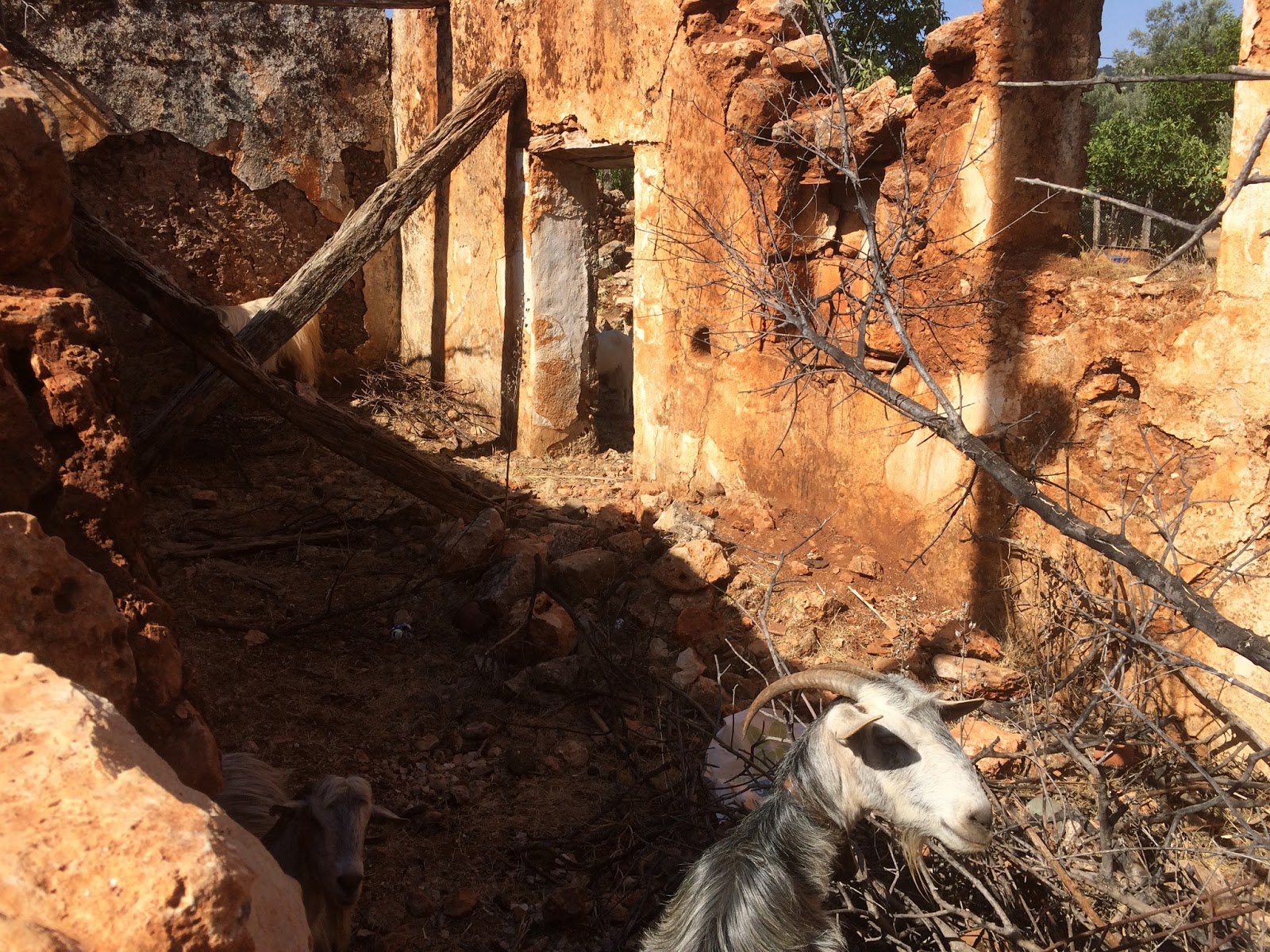 Τα ερειπωμένα σπίτια στέκουν αγέρωχα στο επιβλητικό τοπίο και κάποιες κατσίκες κυκλοφορούν ανέμελες και ανενόχλητες, αποτελώντας τους μόνιμους κατοίκους.